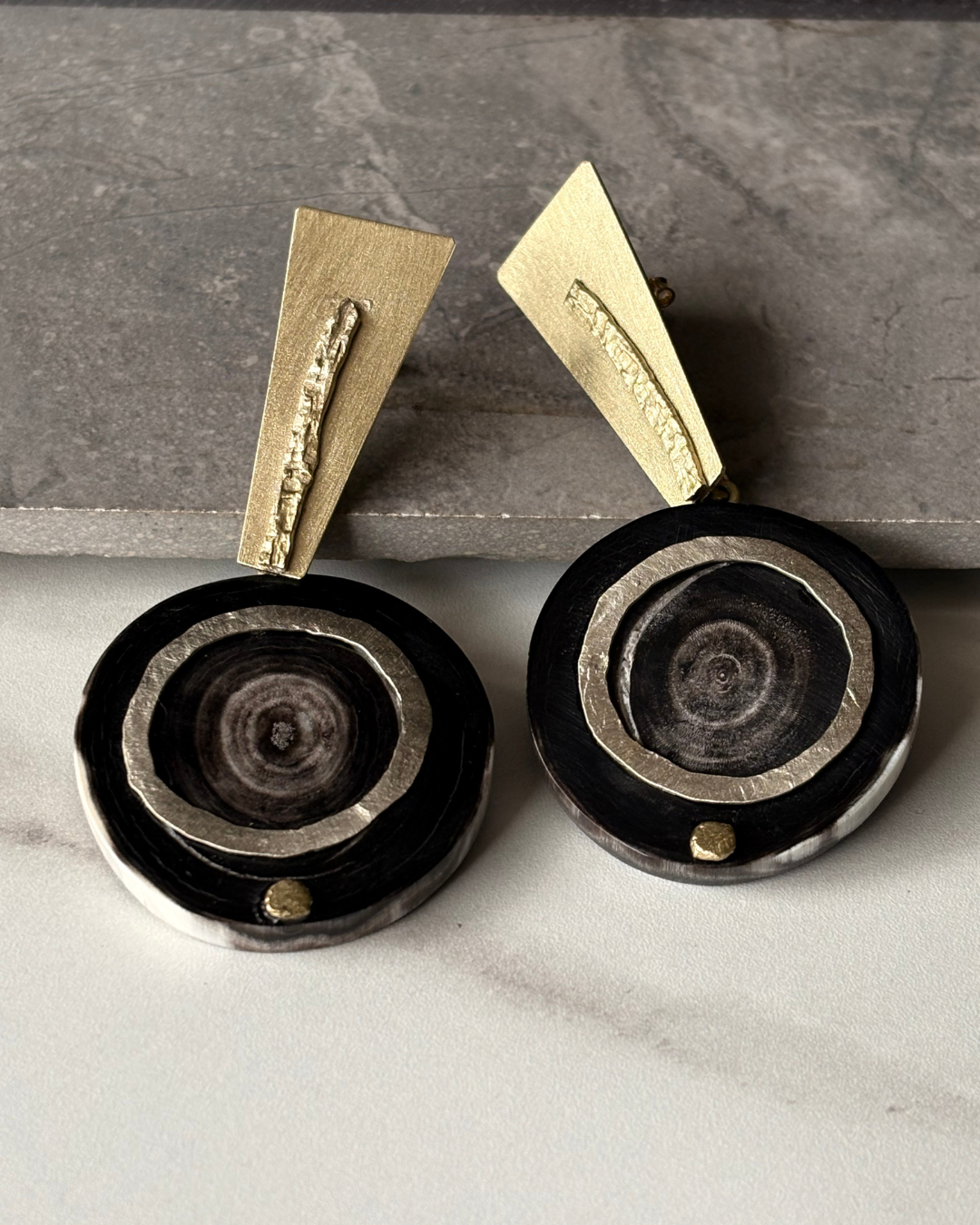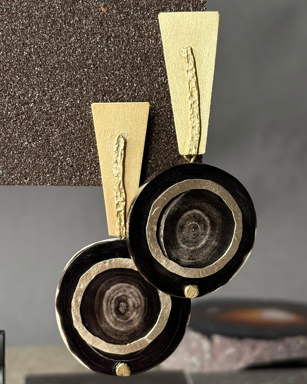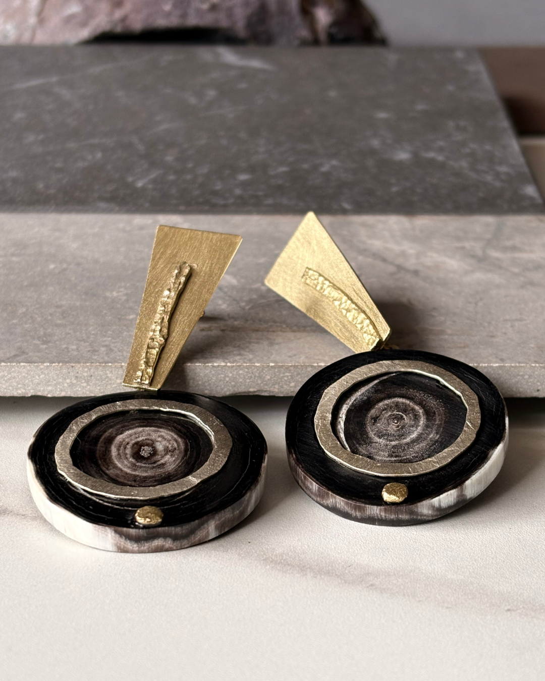 Los Aros Raíz Mixta combinan la fuerza orgánica del cacho natural con delicadas aplicaciones en bronce y alpaca, dando vida a una pieza con identidad profunda y carácter artesanal. La mezcla de materiales crea un contraste armónico entre texturas cálidas y tonos metálicos, resaltando la belleza de lo natural y lo hecho a mano.