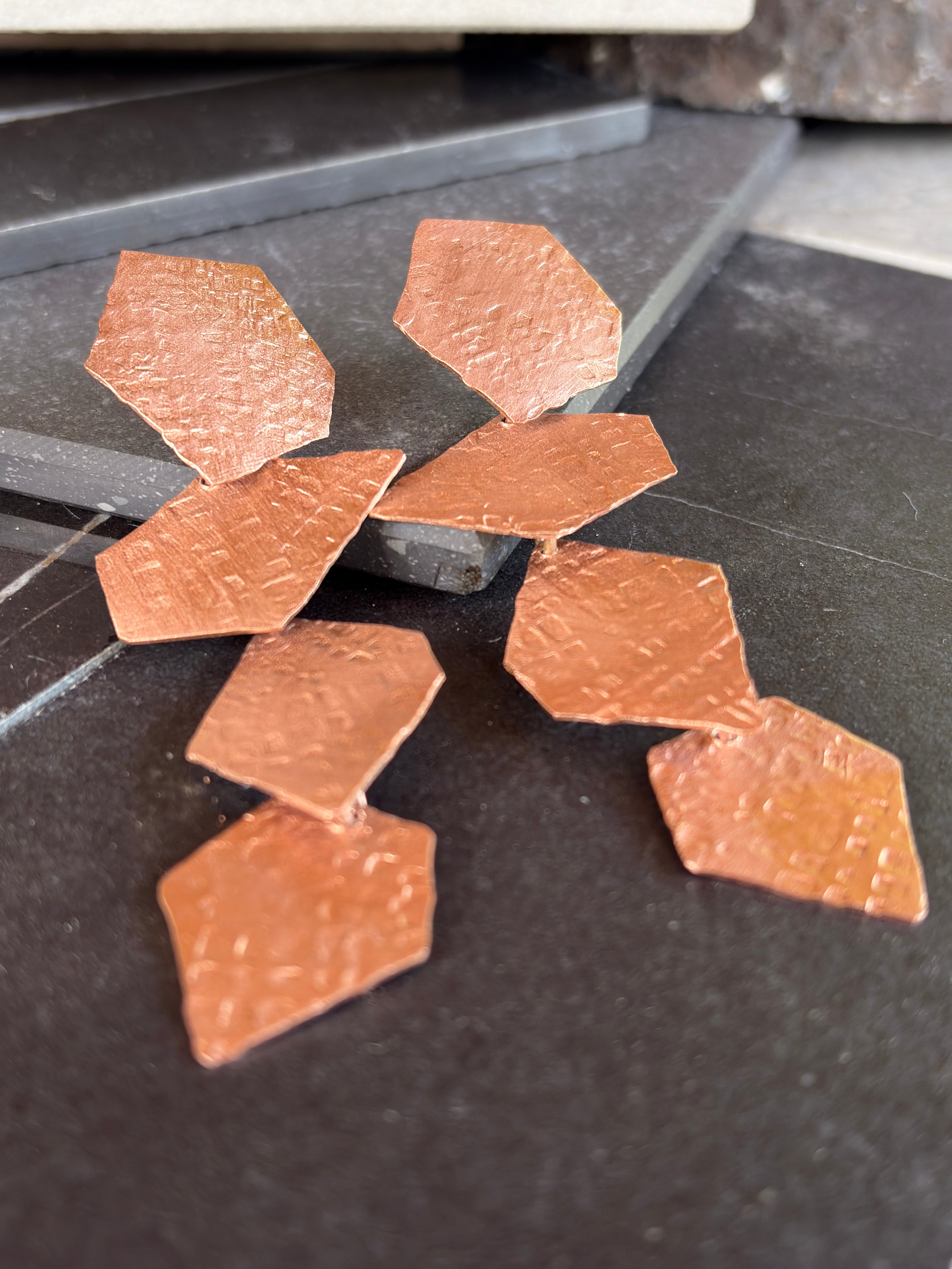 Un diseño dinámico y lleno de movimiento. Estos aros están elaborados en cobre trabajado artesanalmente, con líneas que evocan la fluidez y elegancia de una cascada.