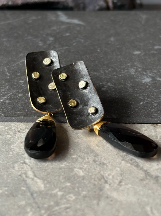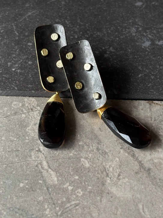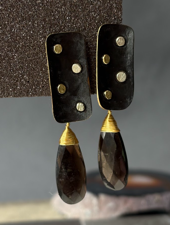 Aros artesanales con diseño de vástago alargado, elaborados en cobre con pátina negra que resalta la textura y el carácter del metal. Cada aro cuenta con delicadas aplicaciones de bronce y piedras de cuarzo fumé, creando un contraste elegante y sofisticado. Su estilo único aporta presencia y versatilidad, convirtiéndolos en un accesorio ideal para looks cotidianos o especiales. Cada par es trabajado a mano, reflejando la identidad de la joyería de autor de Verónica Piraino y garantizando que cada pieza sea irrepetible.