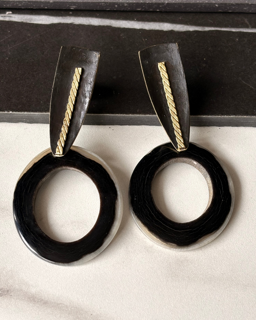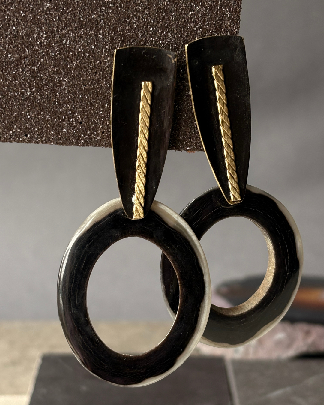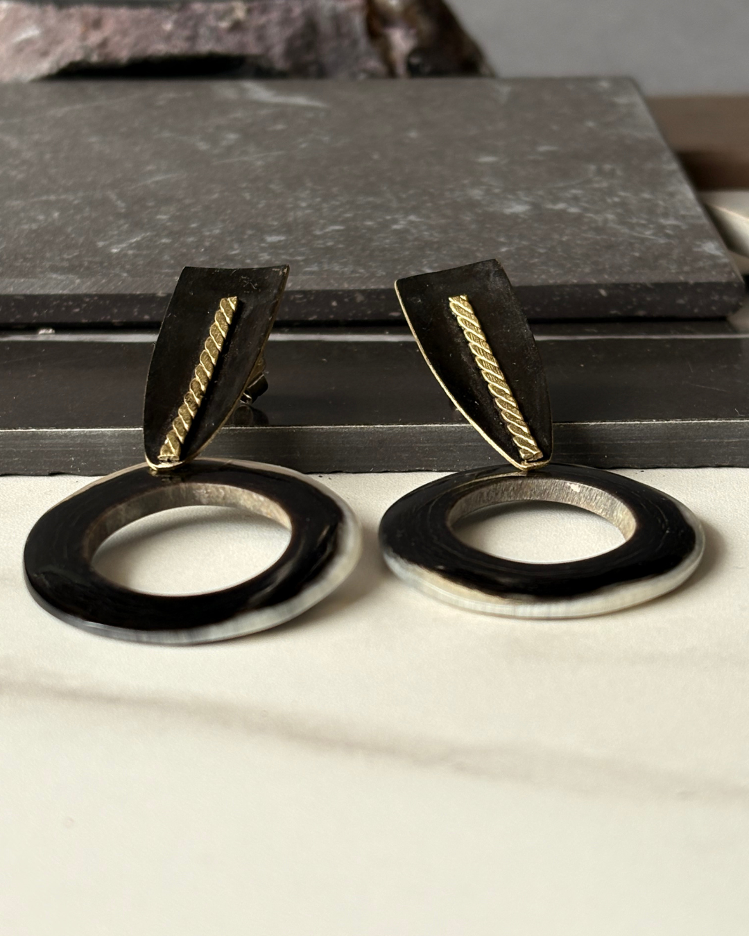 Los Aros Raíz Oscura combinan la nobleza del cacho natural con un tope de bronce con pátina negra, creando una pieza de fuerte identidad y carácter contemporáneo. El contraste entre la textura orgánica del cacho y el acabado oscuro del bronce aporta profundidad visual y una elegancia sobria.