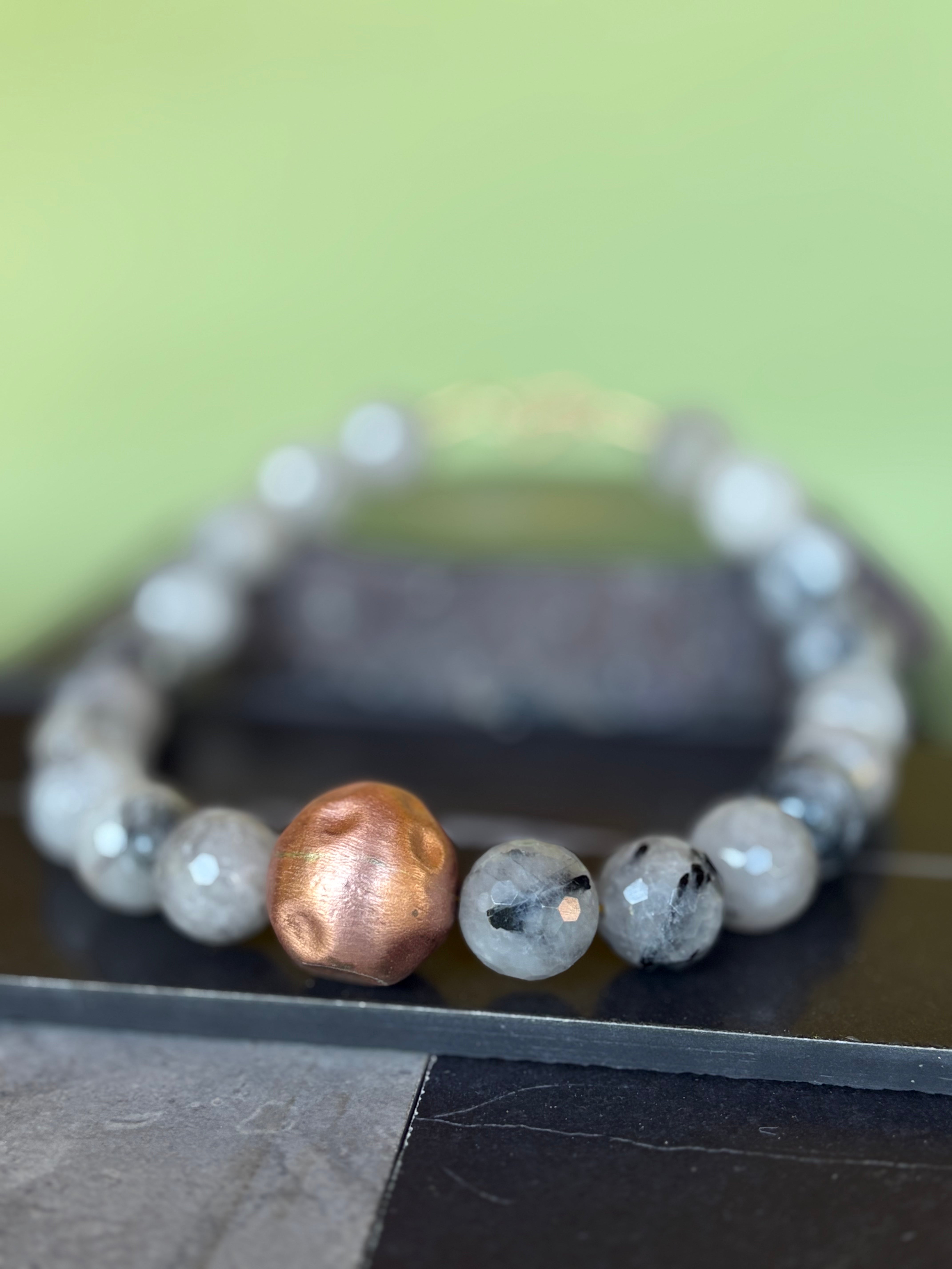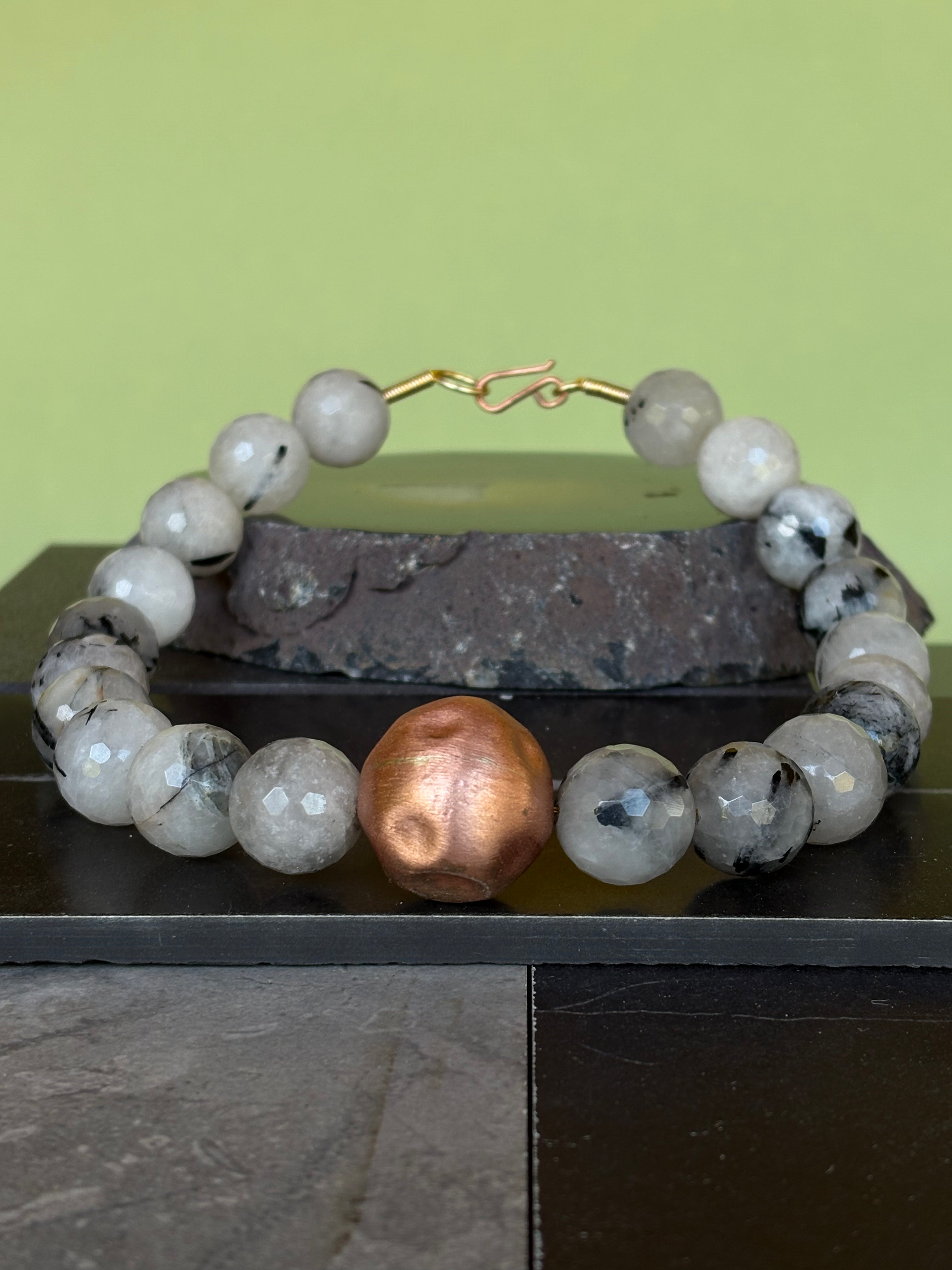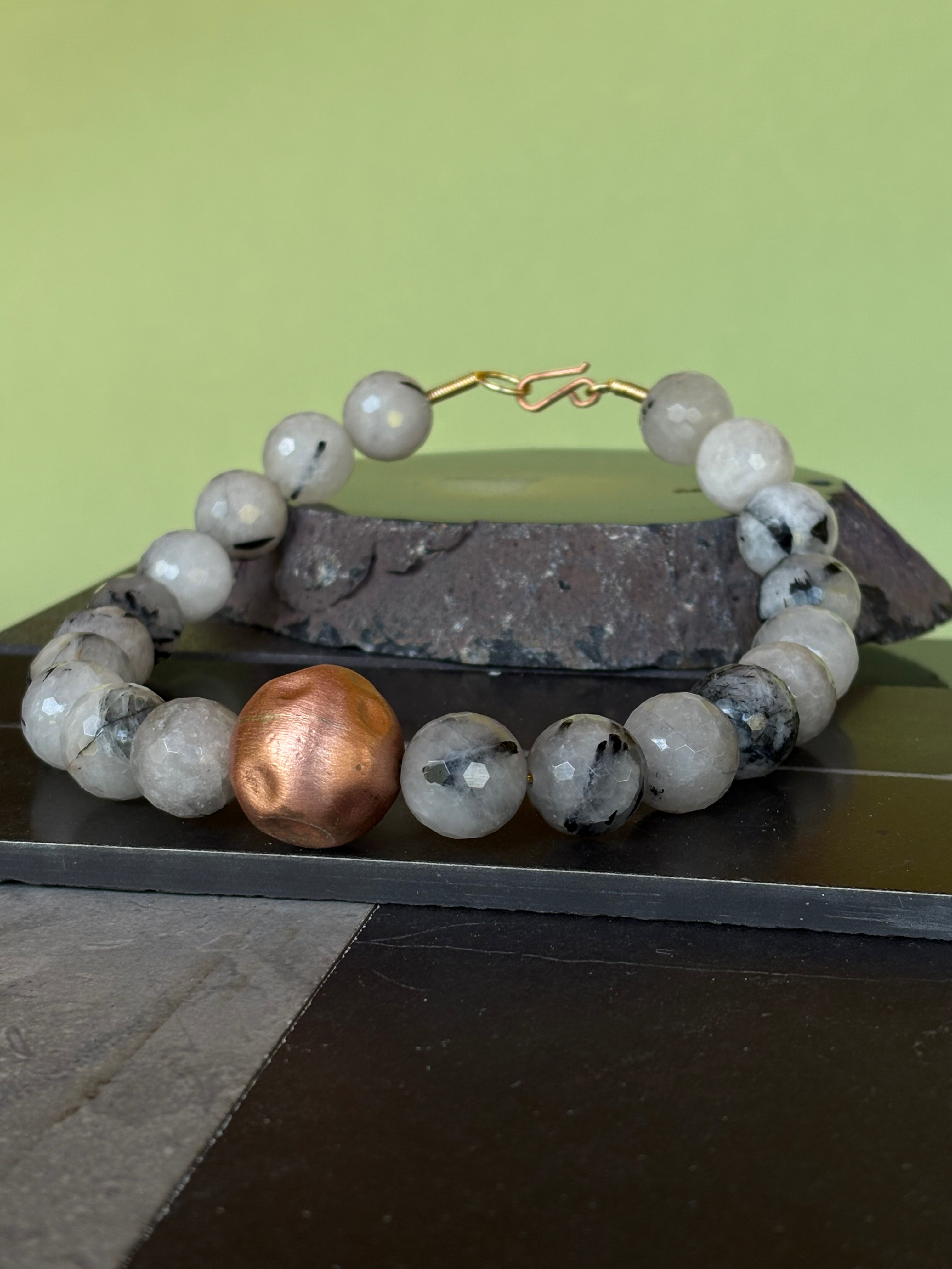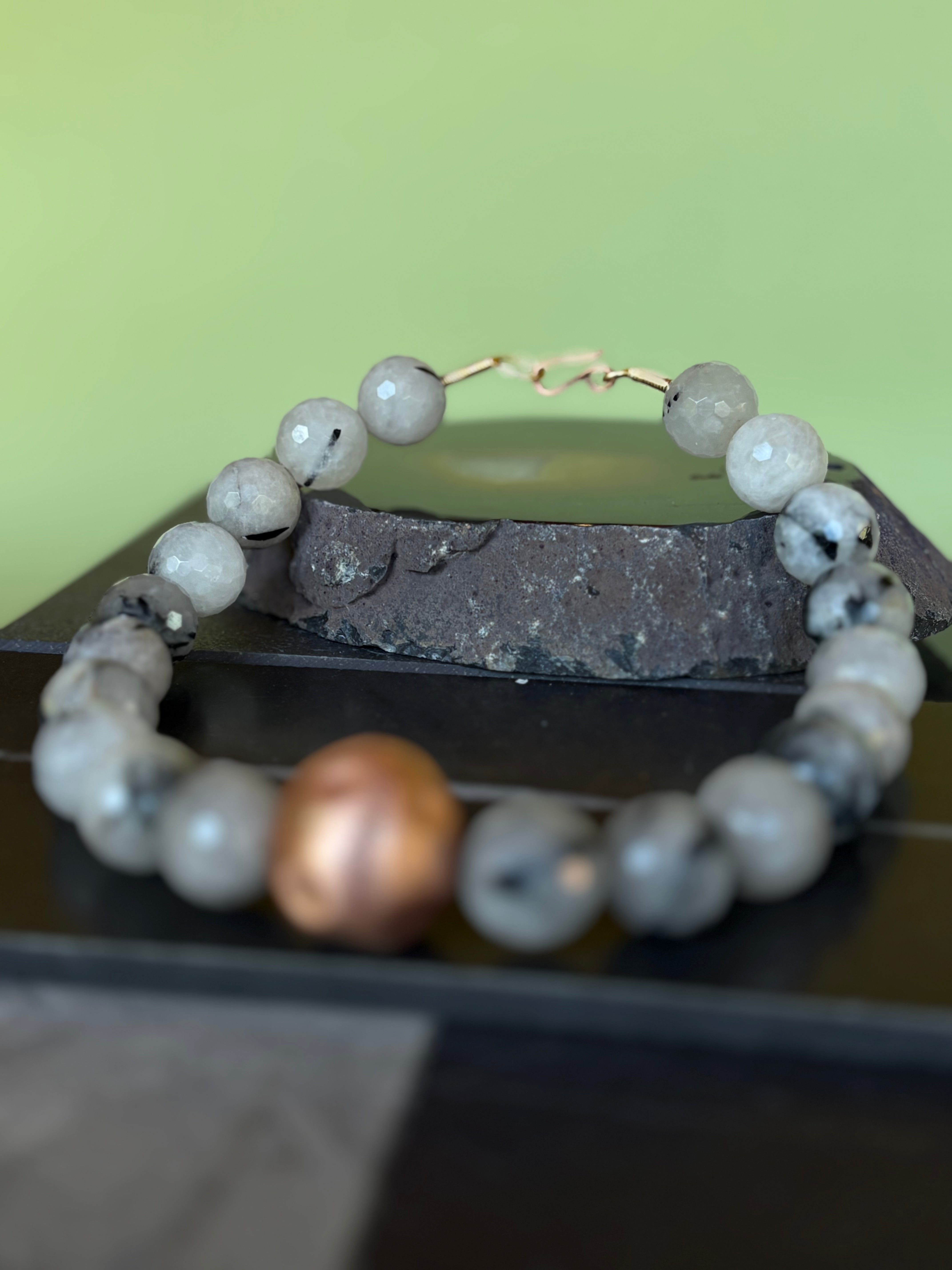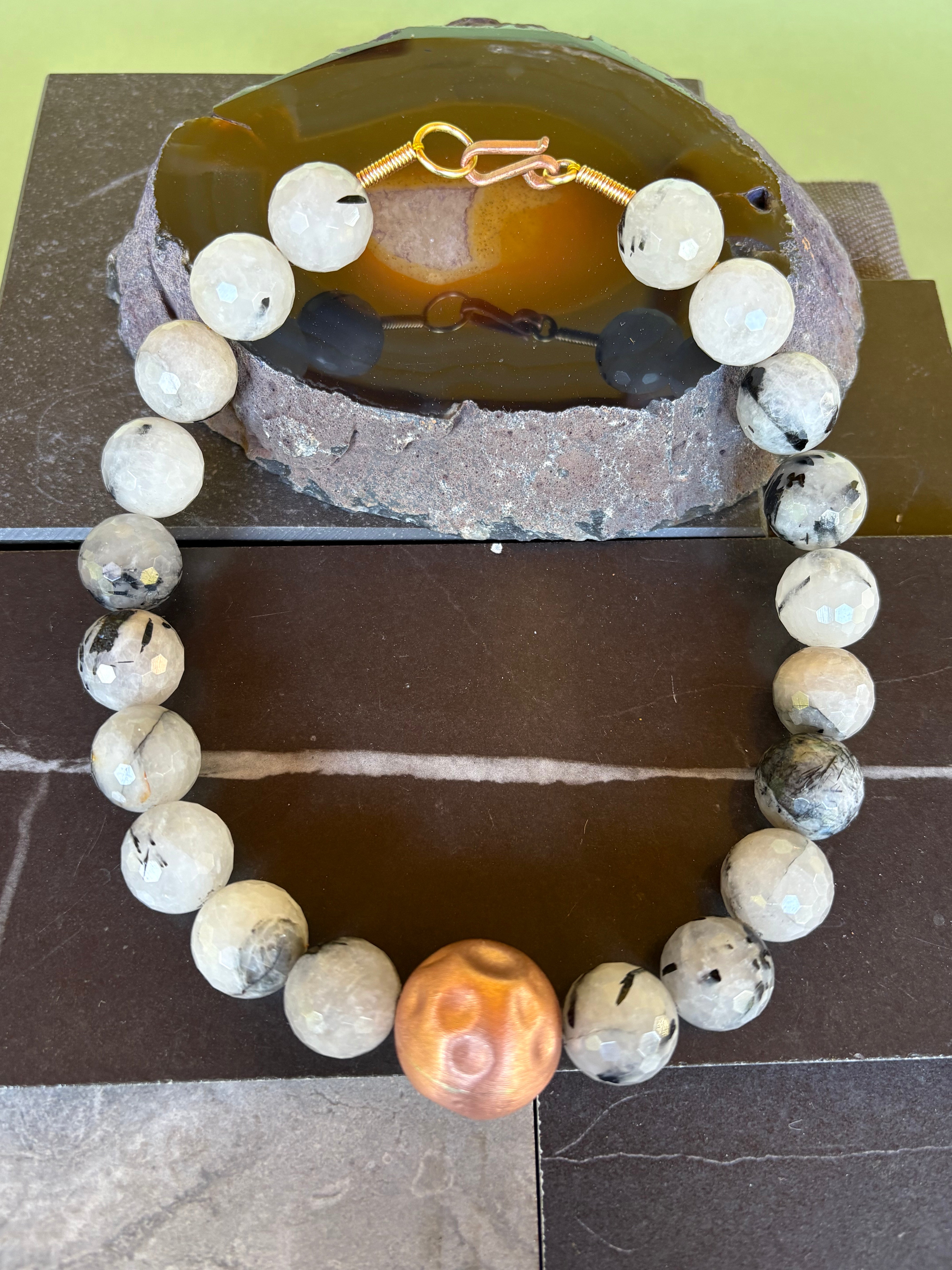 Un diseño que resalta la fuerza y la luz de lo natural. Este collar está elaborado con una piedra de ágata faceteada de 2 cm en el centro, cuya tonalidad única refleja energía y elegancia. Y su esfera de bronce aporta calidez y contraste, realzando la belleza de la piedra protagonista.