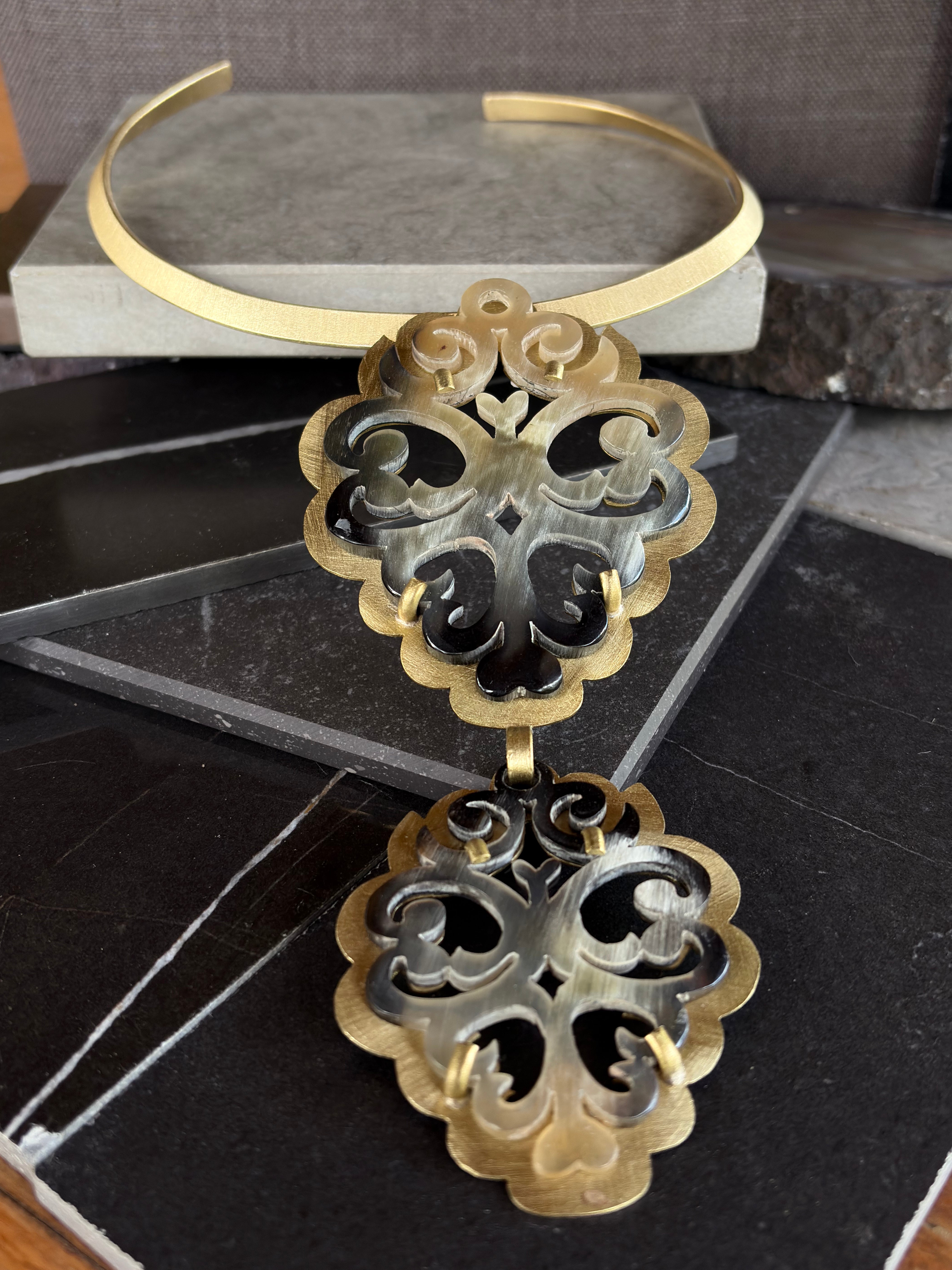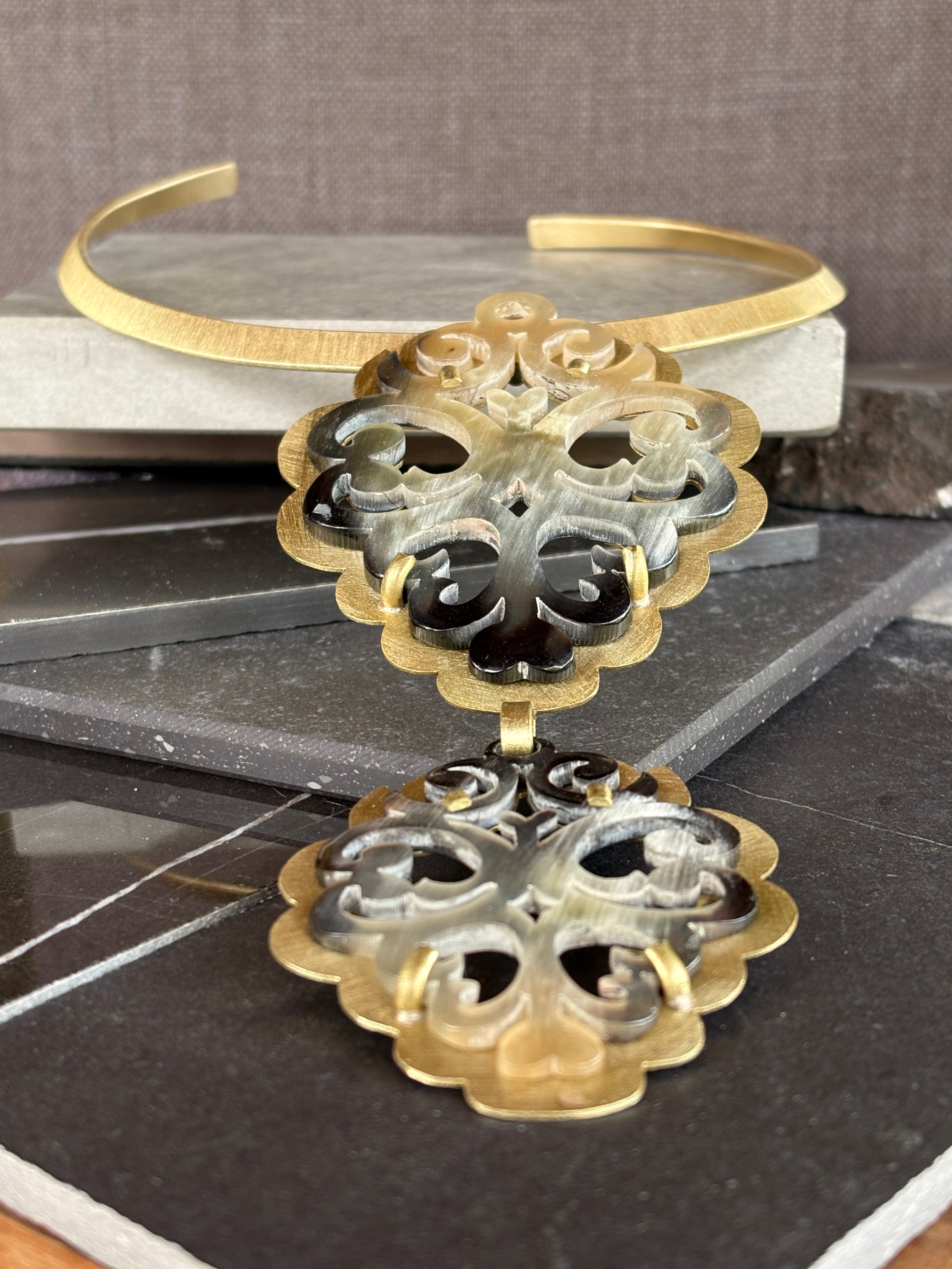 El Collar Aura Tribal destaca por su contraste armónico entre lo natural y lo metálico. Su pieza central en cacho calado, trabajada con dedicación artesanal, revela formas orgánicas y ligeras que dialogan con la calidez del bronce en una composición equilibrada y llena de carácter.
