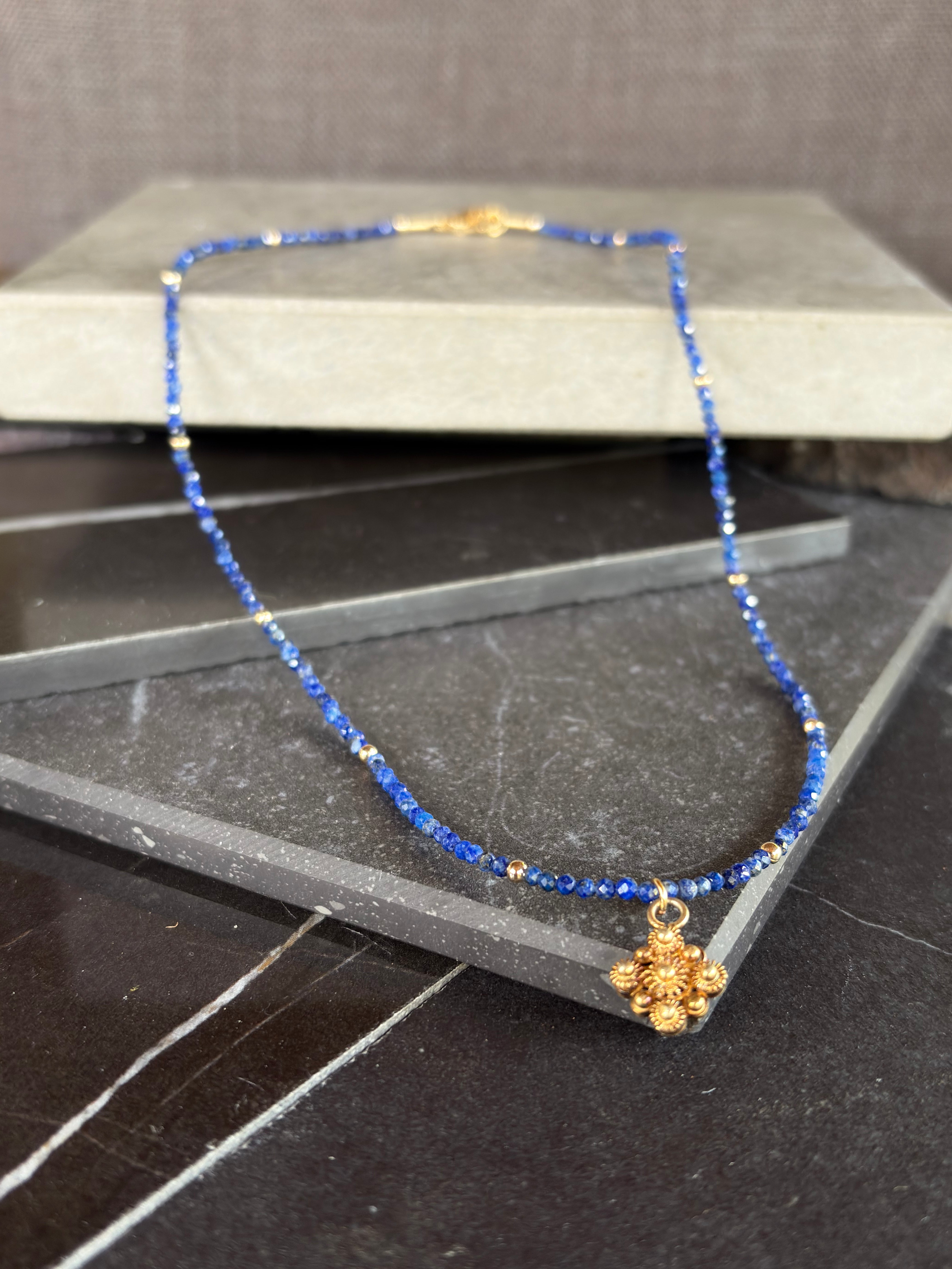 Material: lapislázuli natural y plata bañada en oro grabada