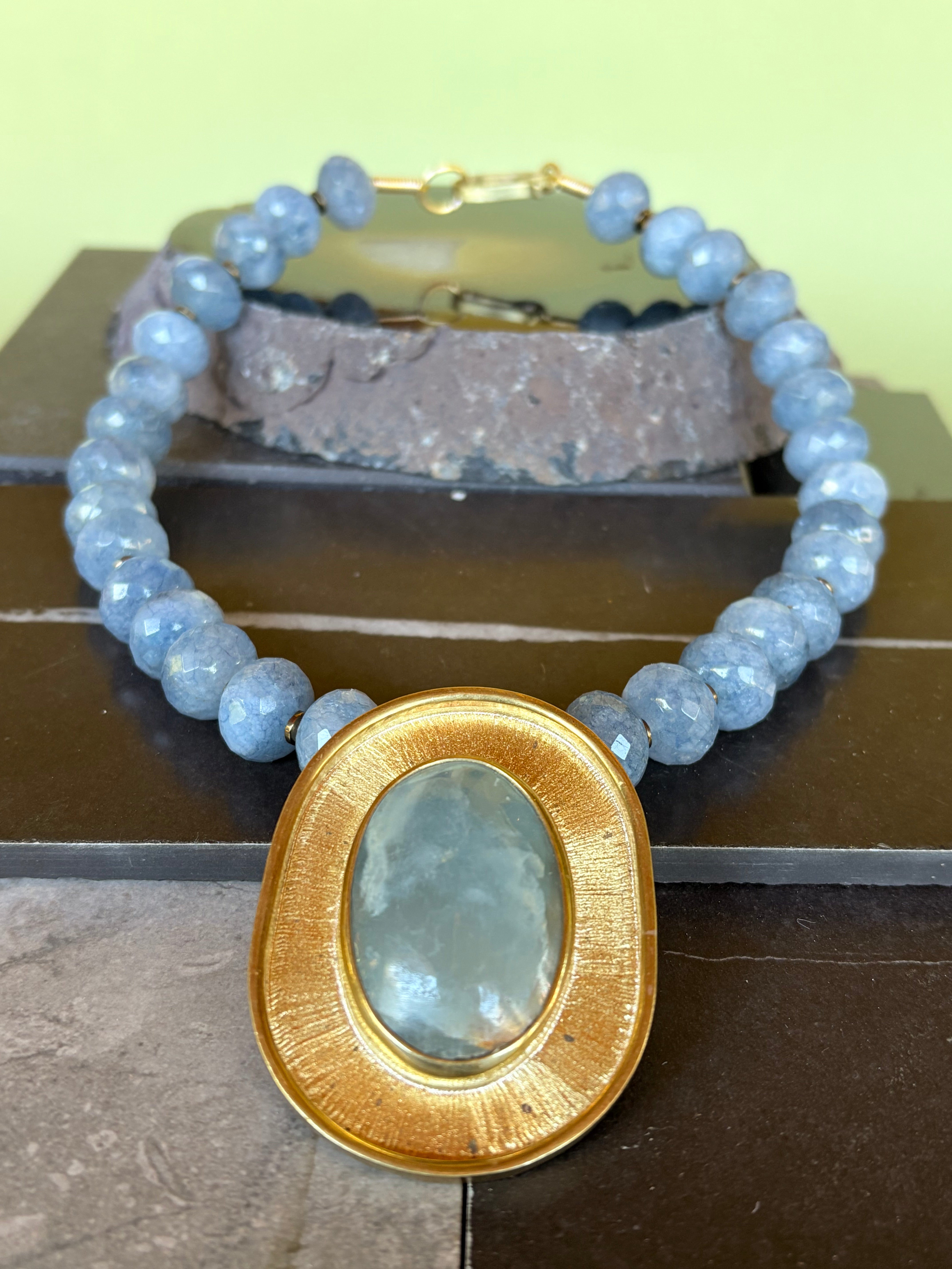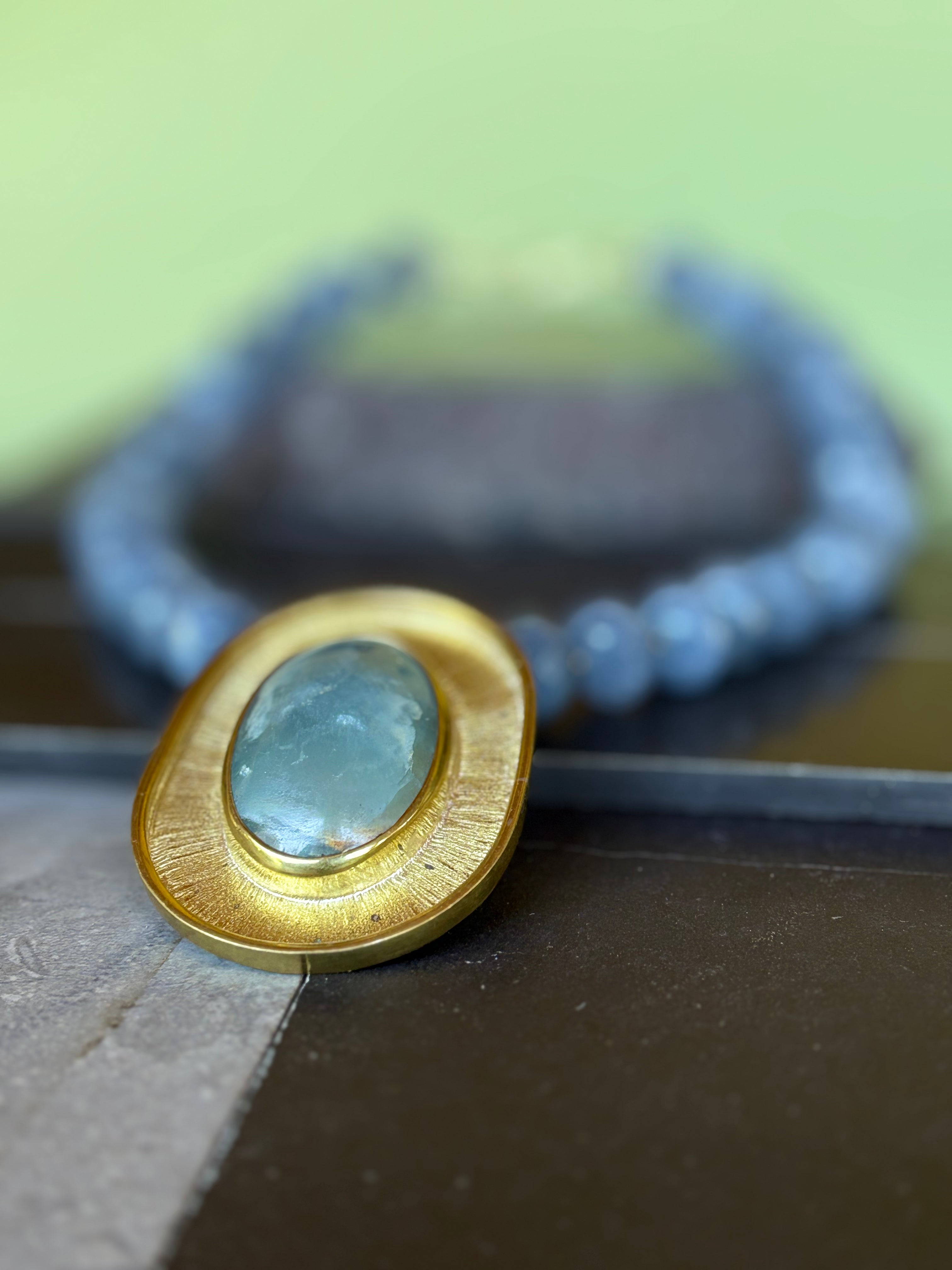 Material: aguamarina faceteada, medallón de bronce y ónix cielo
