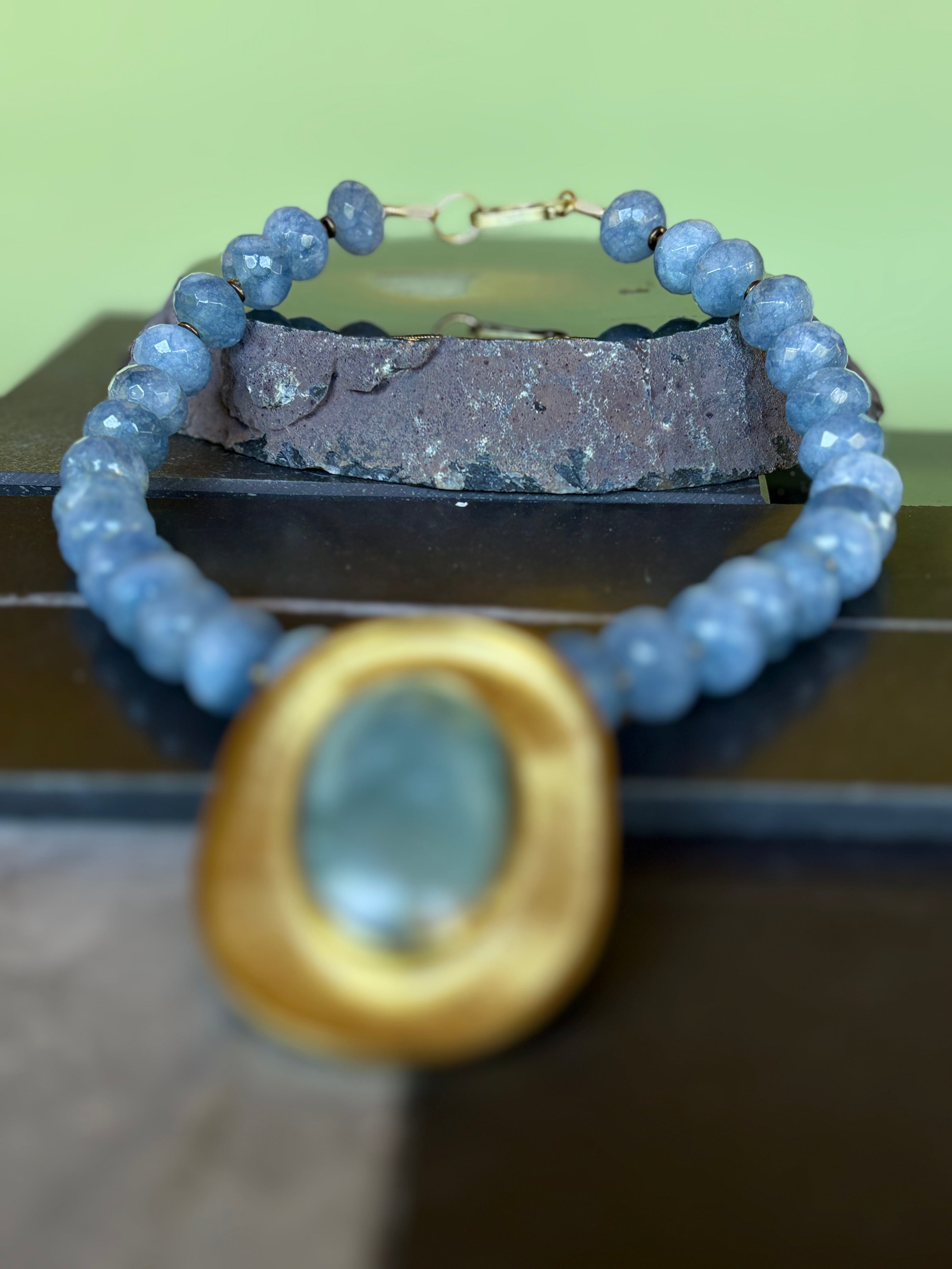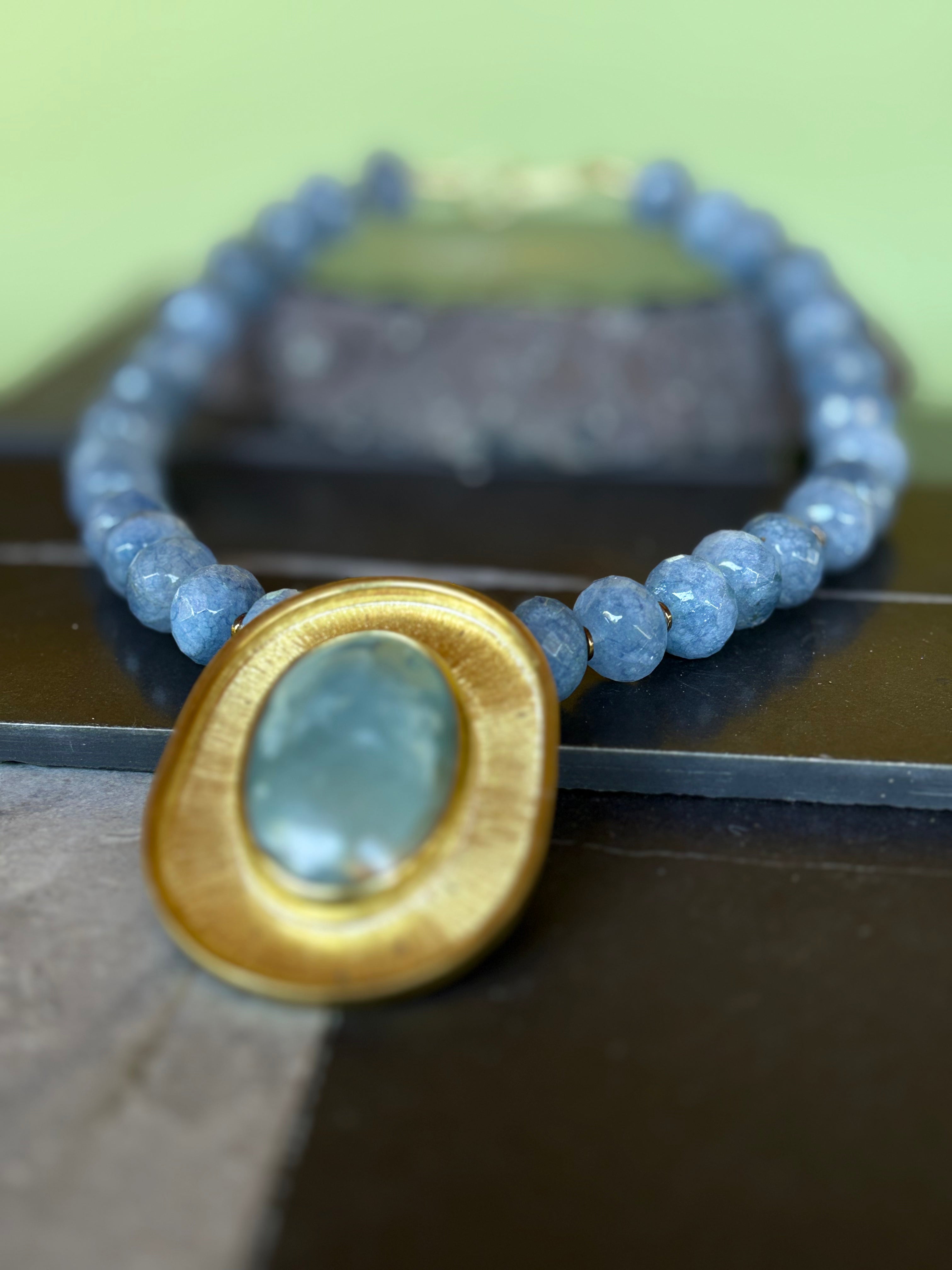 Un diseño que evoca calma y profundidad. Este collar de 42 cm está elaborado con piedras de aguamarina faceteadas, que destacan por sus tonos azulados llenos de frescura y serenidad. Al centro, un medallón de bronce sostiene una piedra de ónix cielo, que aporta contraste y un aire sofisticado.