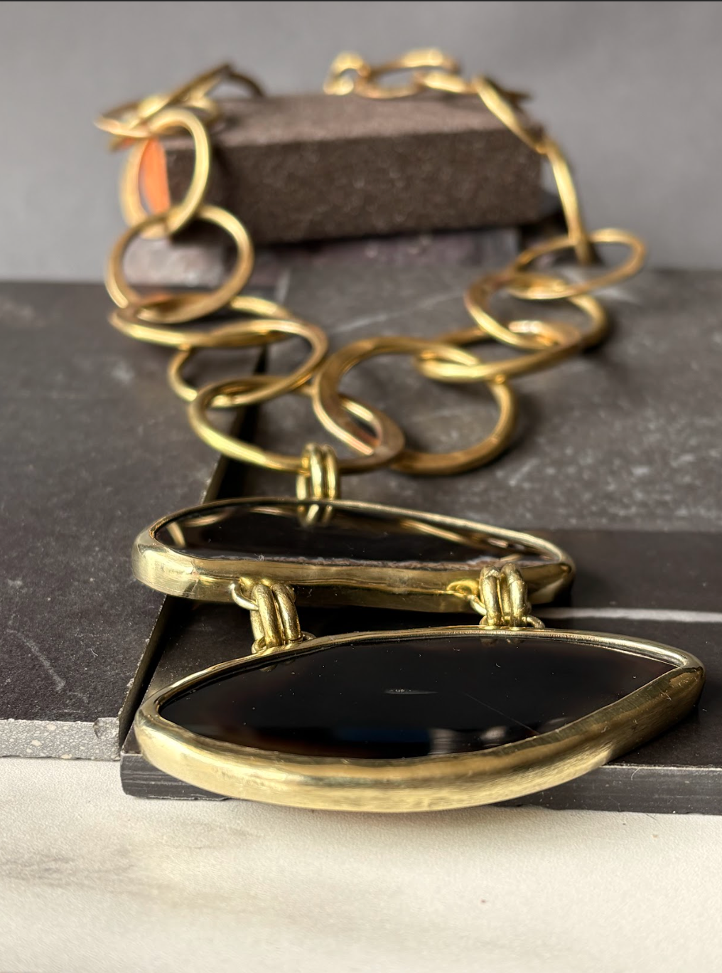Collar corto elaborado en bronce, decorado con ágatas que aportan textura y tonos naturales a la pieza. Su diseño equilibrado y su acabado cálido lo convierten en un accesorio elegante y versátil, ideal para realzar looks cotidianos o complementar atuendos más sofisticados con un toque artesanal.