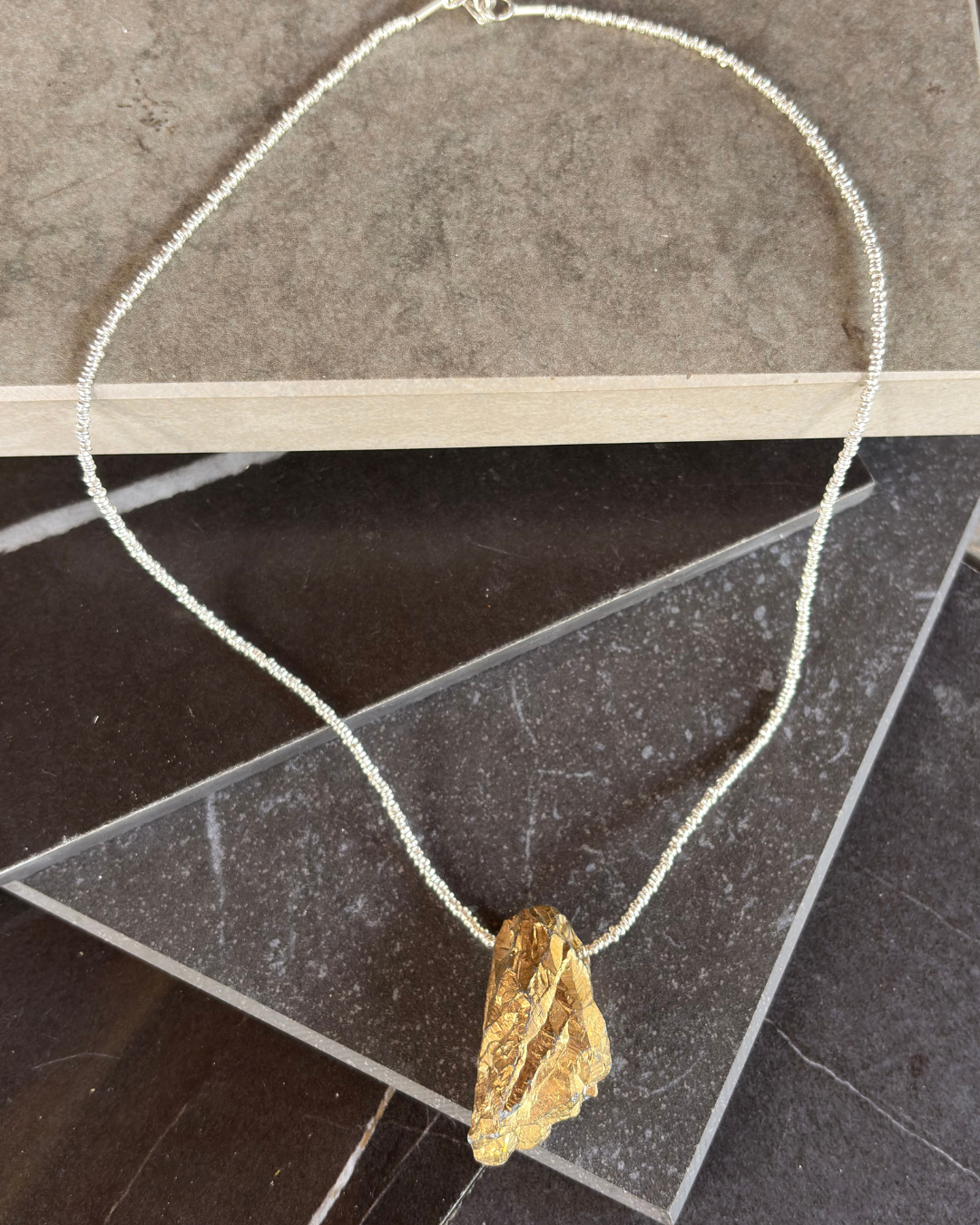 El Collar Esencia Mineral combina la fineza de la mostacilla de plata con una piedra natural que aporta color, textura y energía. Su diseño delicado y equilibrado lo convierte en una pieza versátil, perfecta para realzar el cuello con un brillo sutil y un toque orgánico que acompaña cualquier estilo.