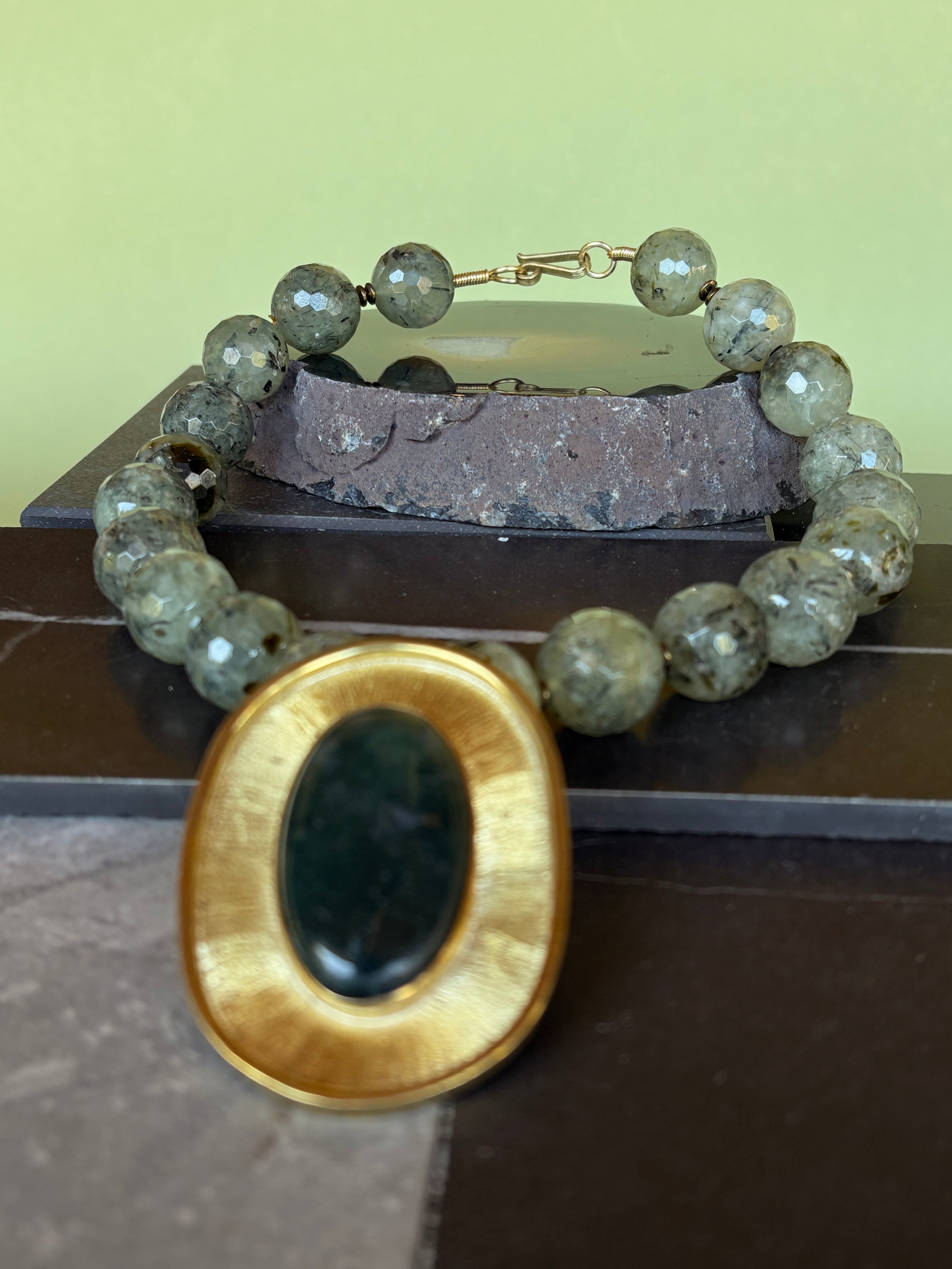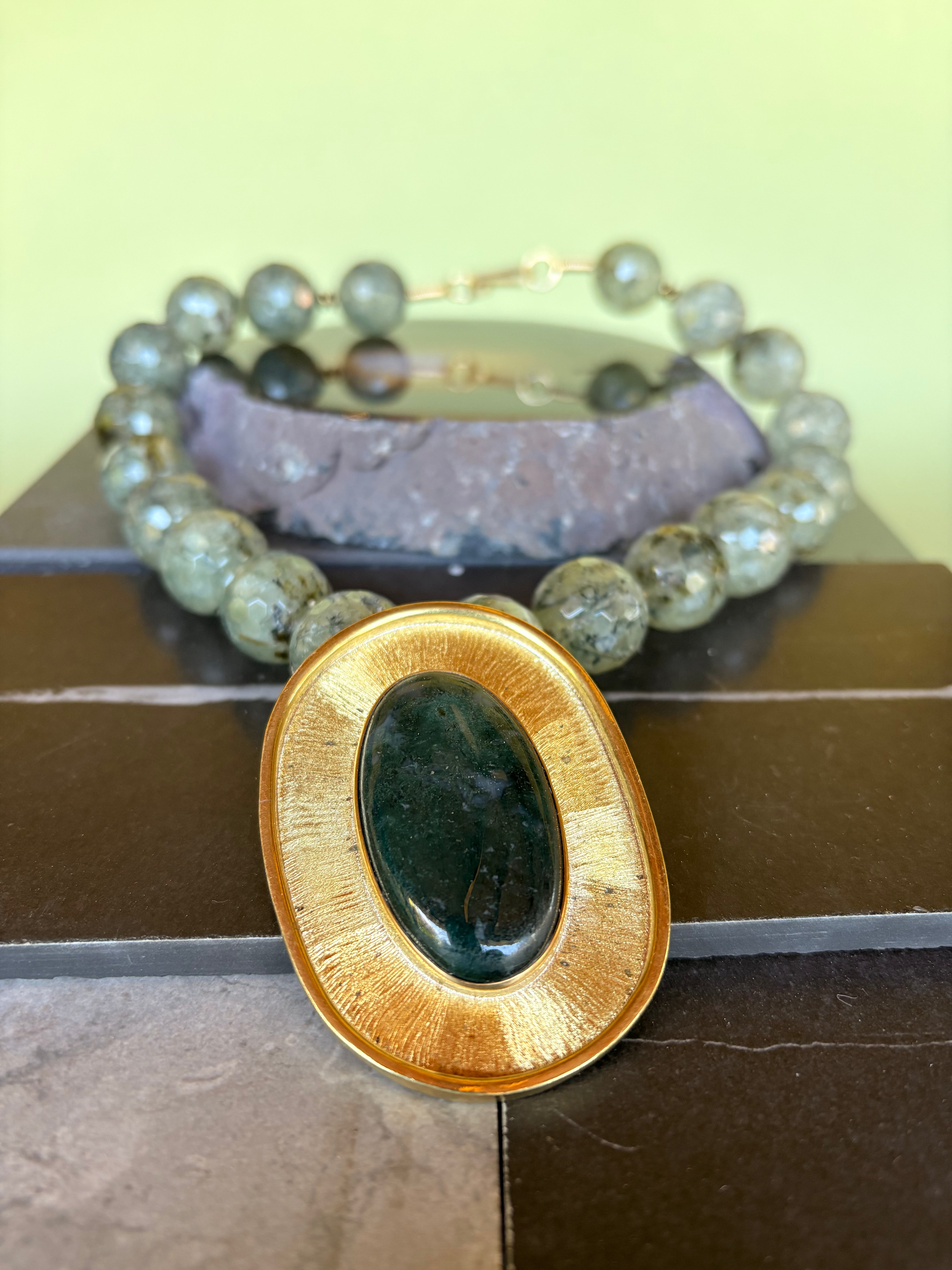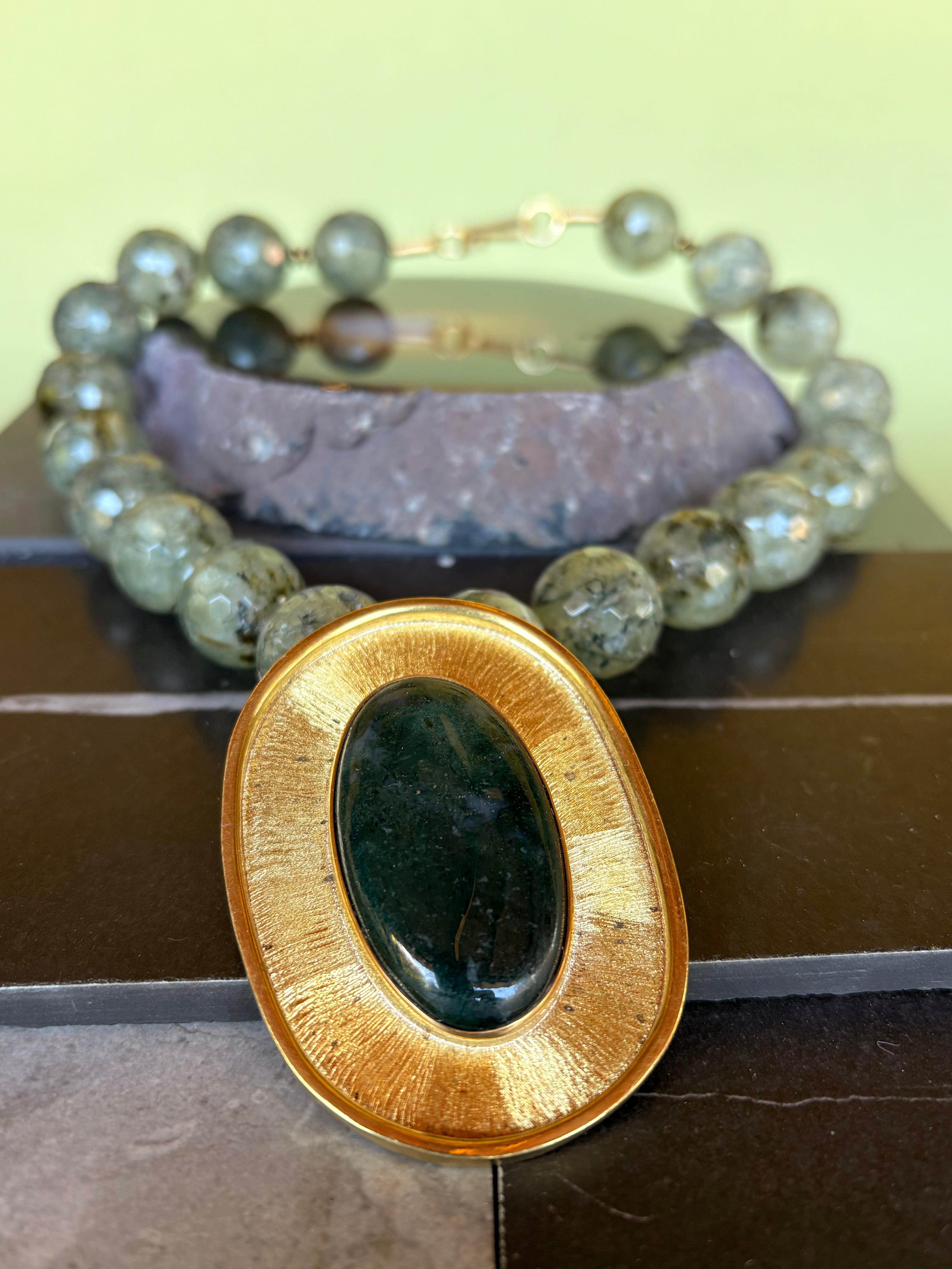 Material: piedras de prehnita, medallón de bronce y piedra serpentina
