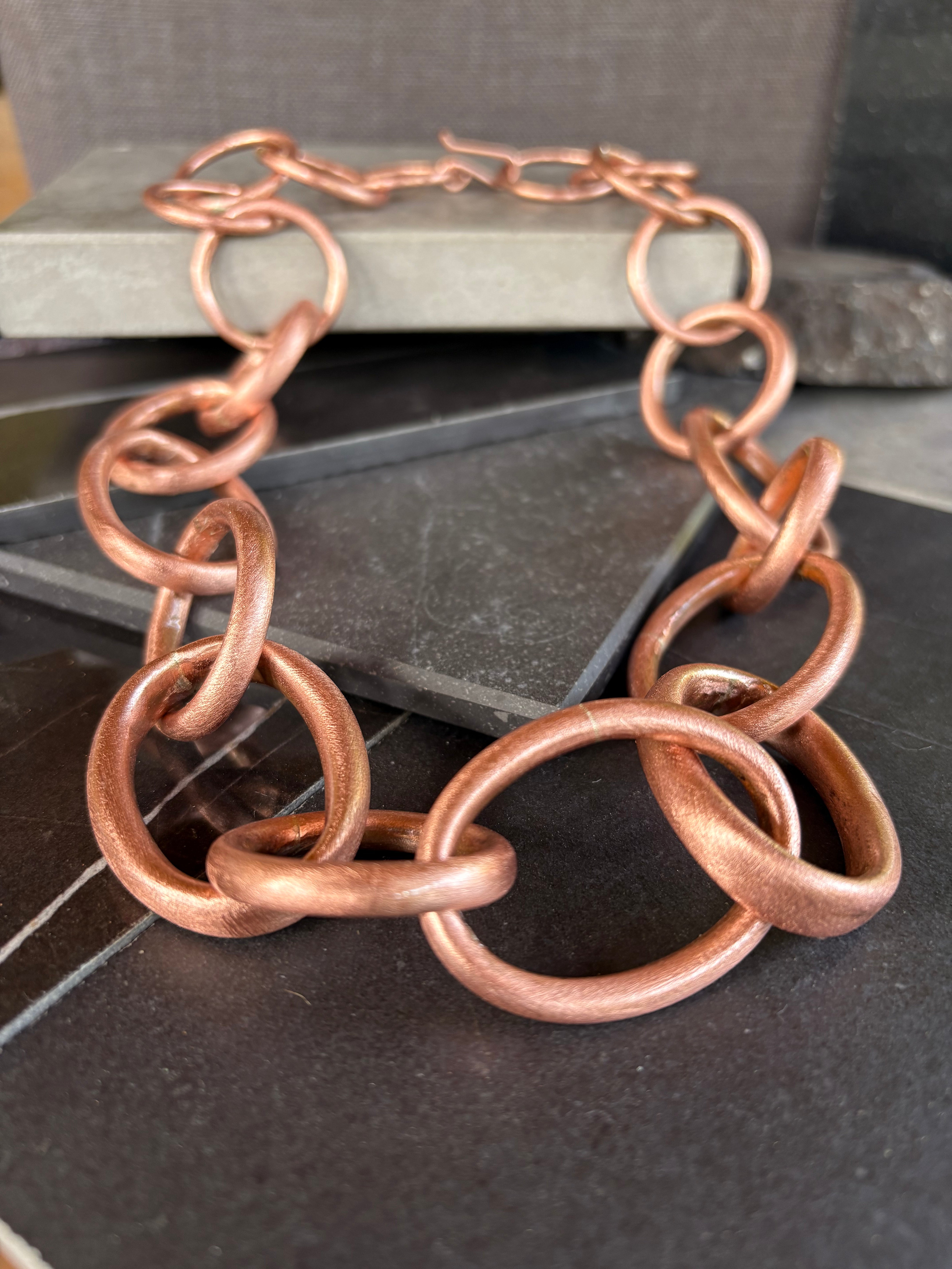 El Collar Libre es una declaración de estilo y oficio. Elaborado en cobre trabajado artesanalmente, sus eslabones asimétricos y huecos crean un juego de formas y vacíos que otorgan movimiento, textura y una presencia única.