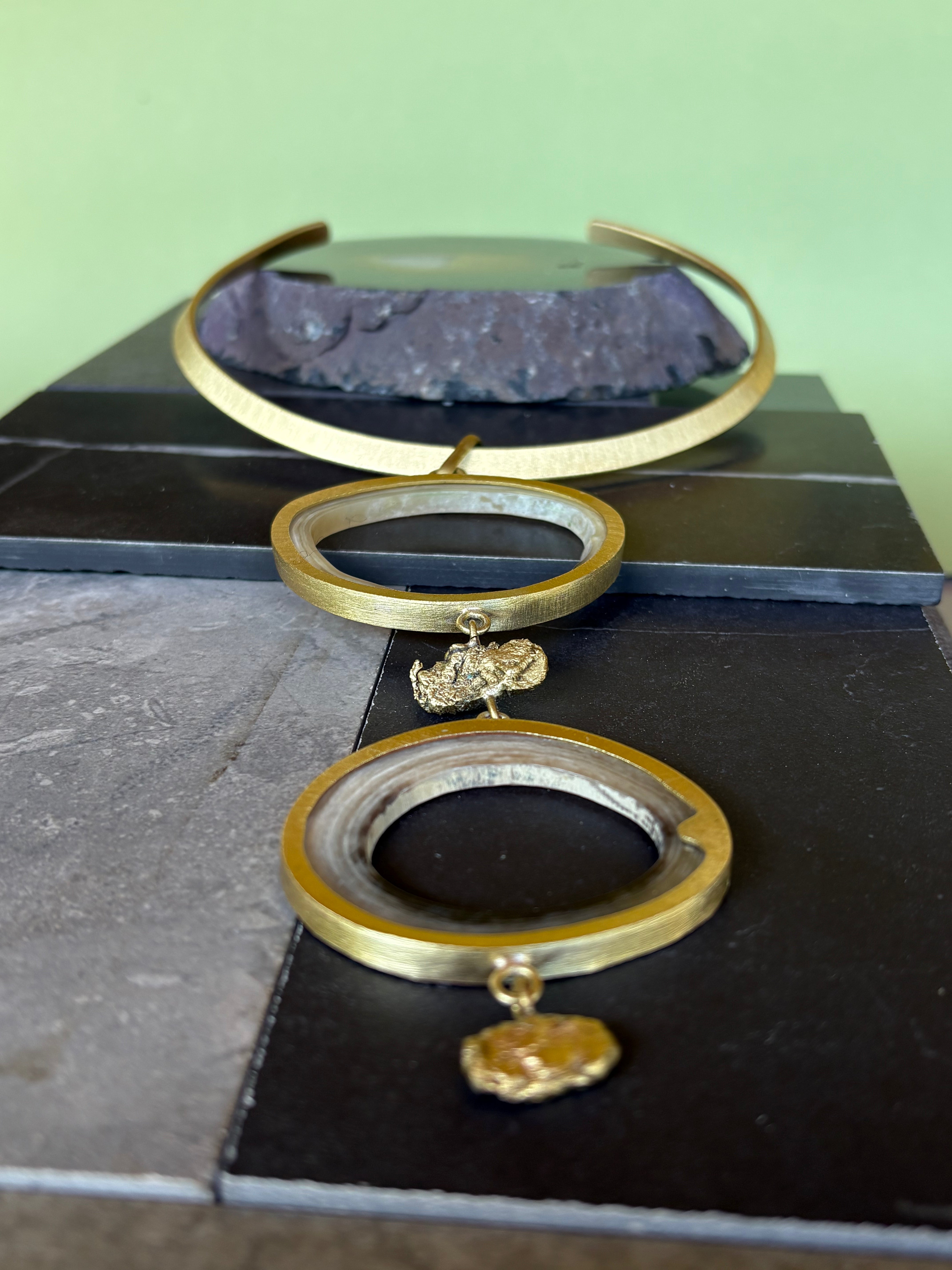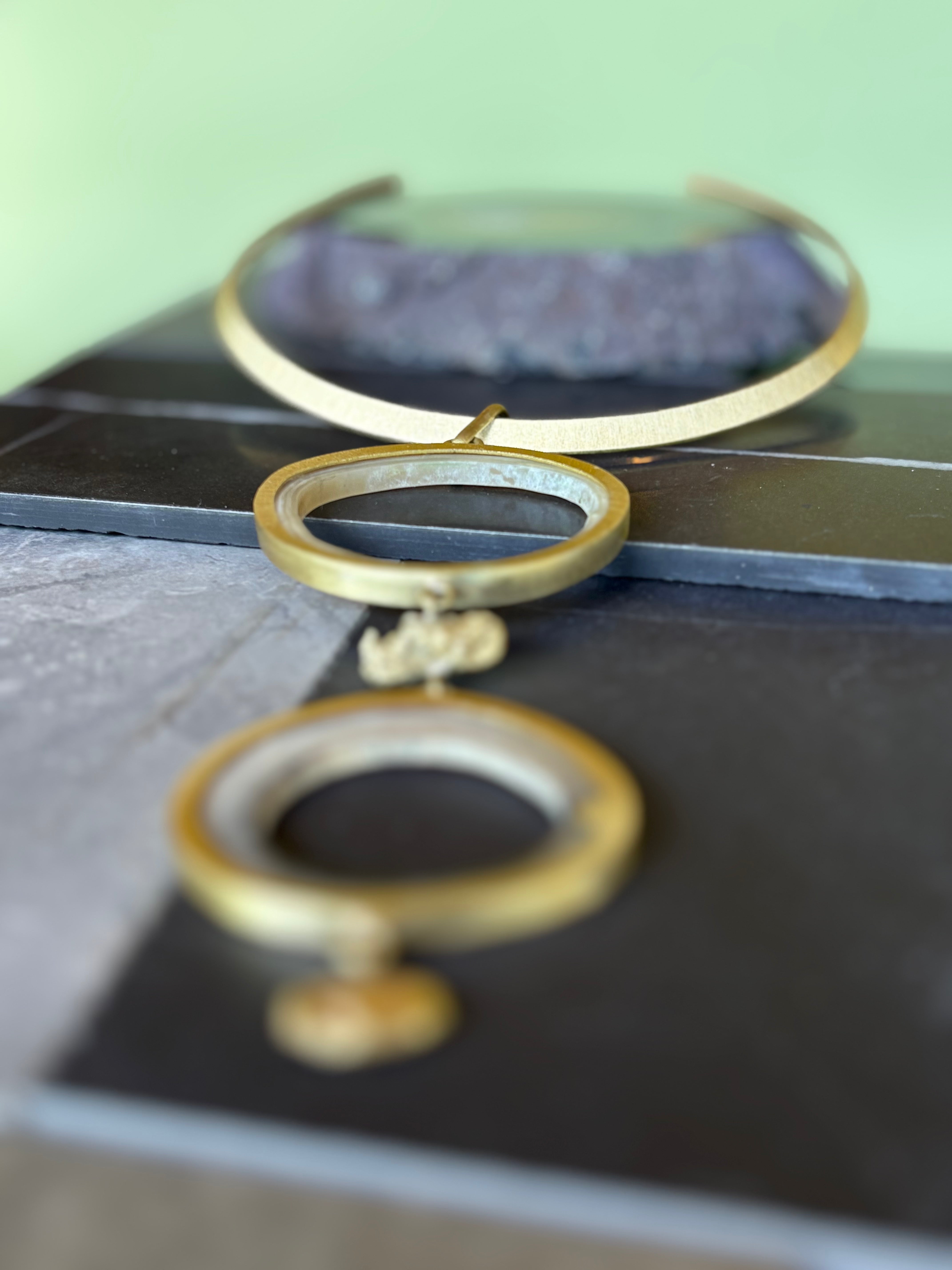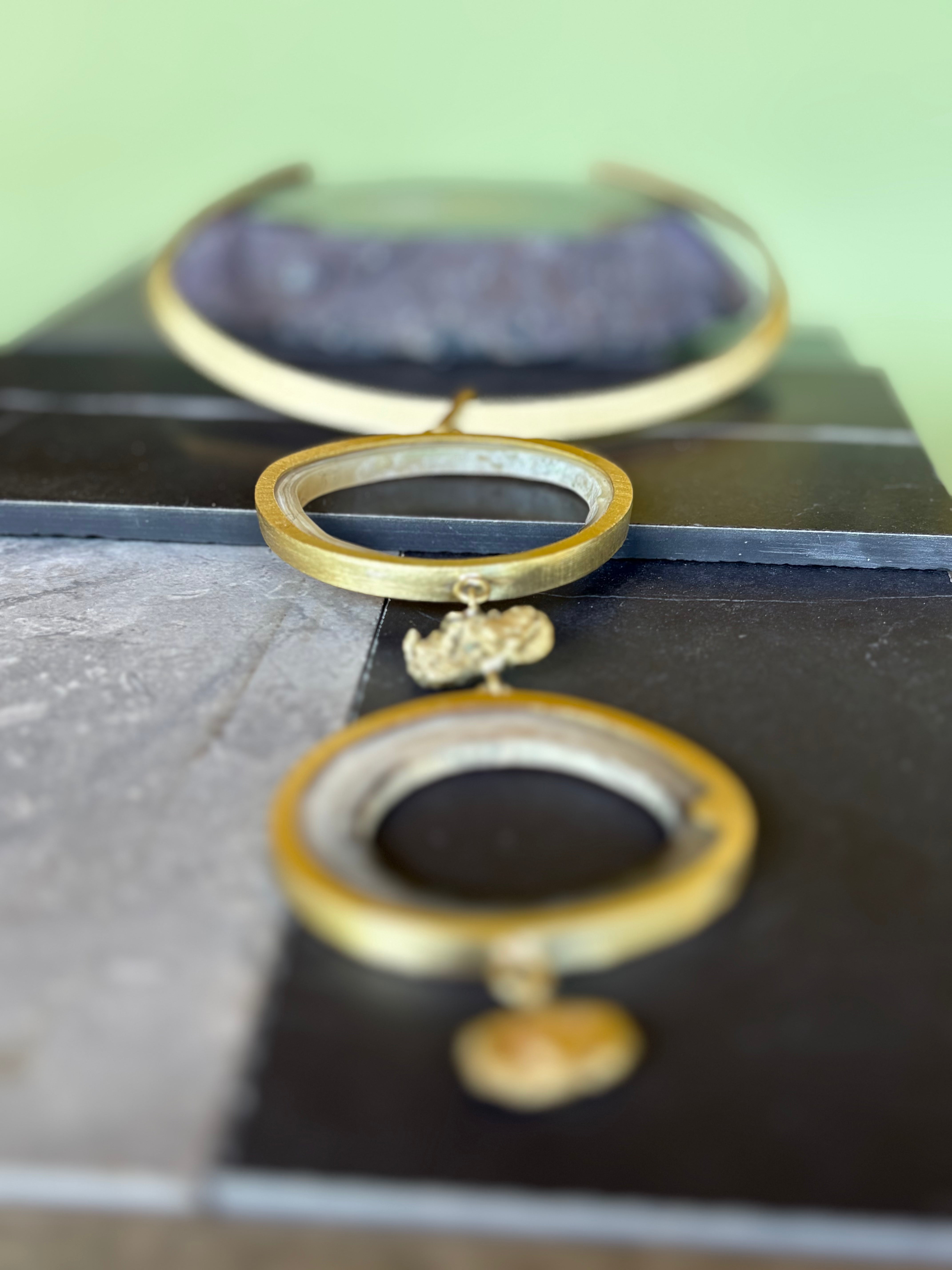Una pieza que celebra lo orgánico y lo artesanal. Esta tiara está elaborada en bronce trabajado a mano e integrada con medallones de cacho natural, cada uno con vetas y tonalidades únicas que resaltan la singularidad de la pieza. En el centro, una pieza de bronce aporta equilibrio y carácter, creando un diseño sofisticado y con fuerza.