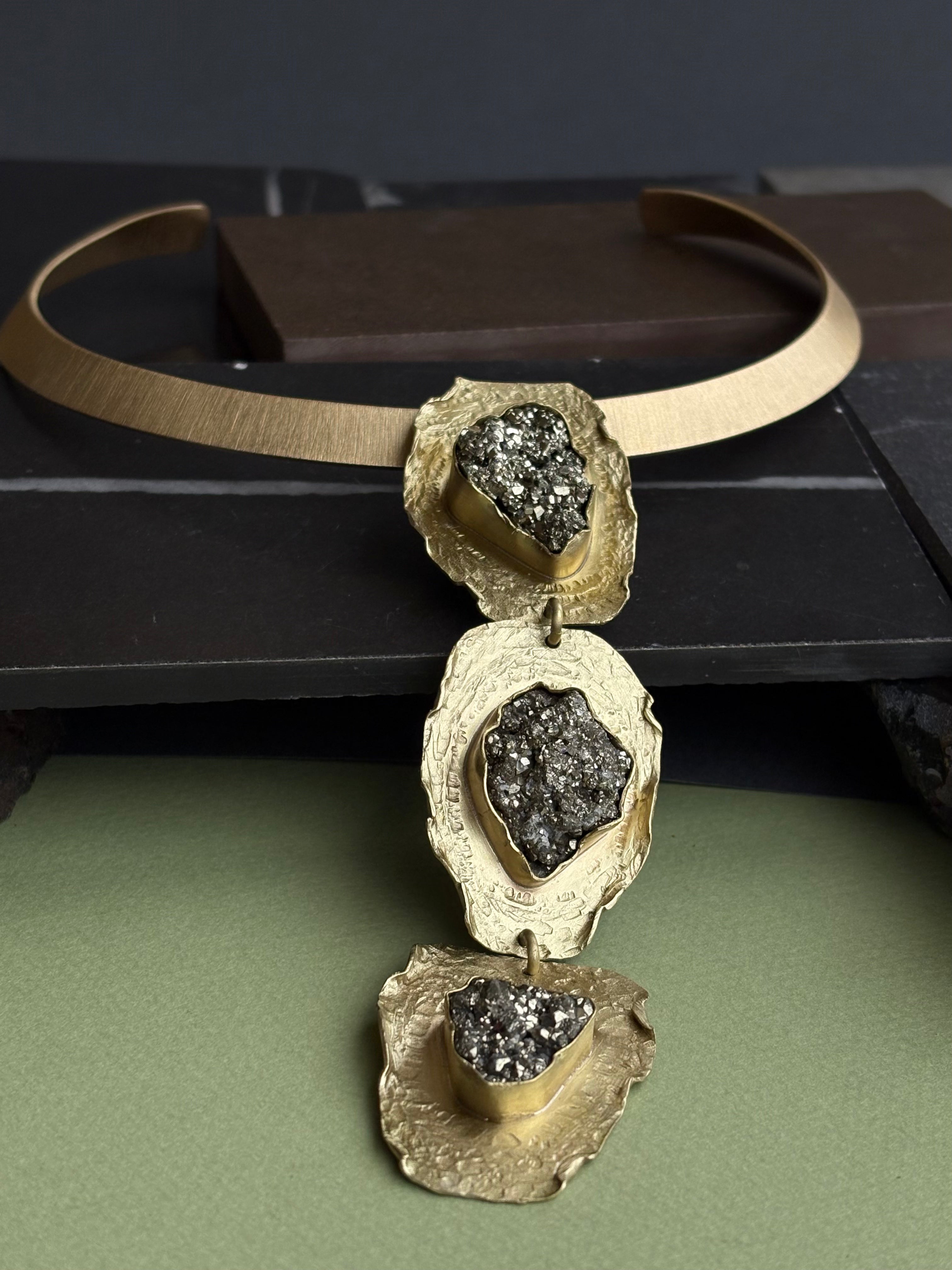 Una joya que irradia fuerza y energía. Esta tiara está elaborada en bronce trabajado a mano e integrada con medallones de pirita, piedra conocida por su brillo metálico y su poder de protección y abundancia.