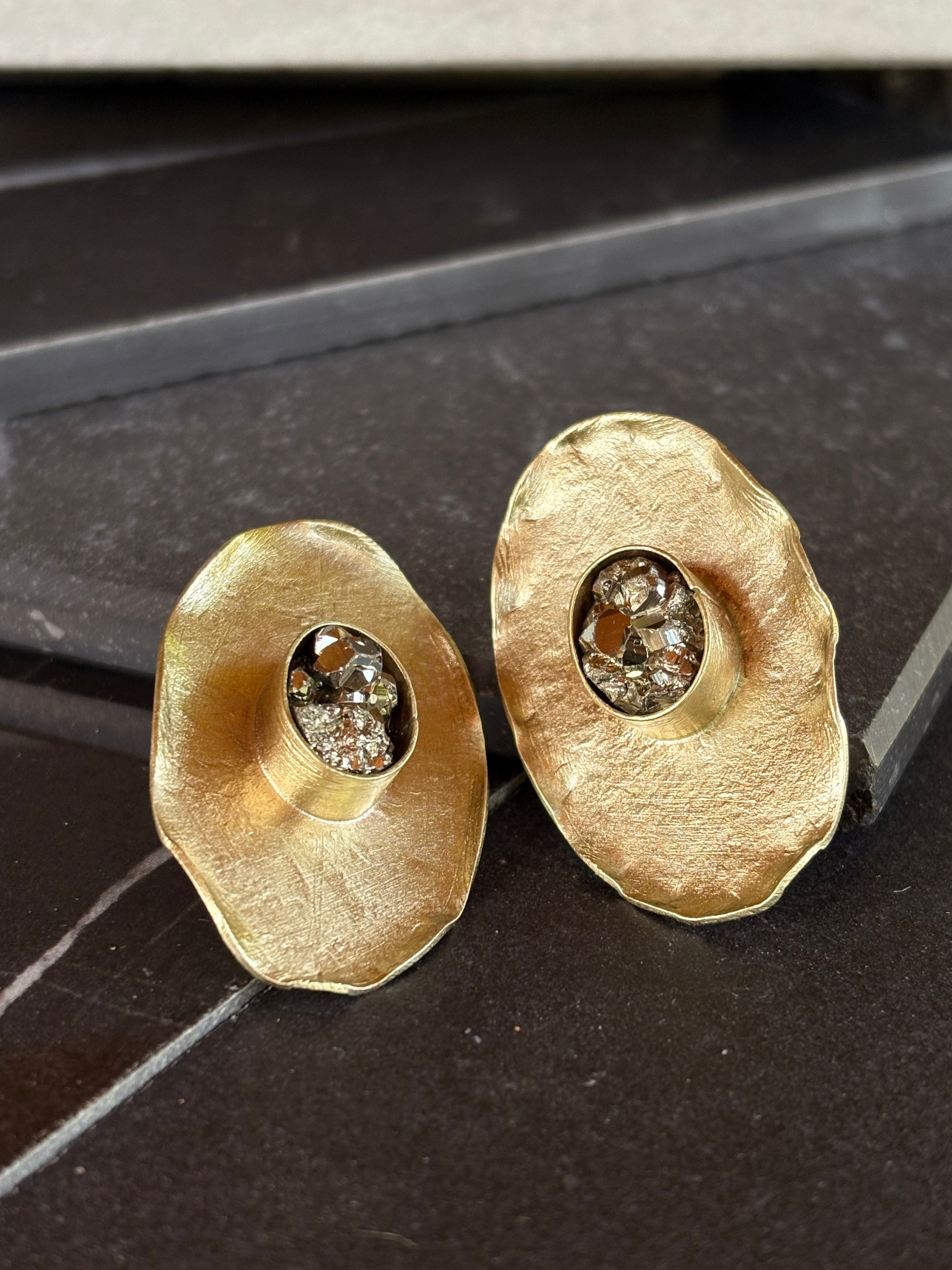 Los Aros Luz Mineral combinan la calidez del bronce con el brillo inconfundible de la pirita, creando una pieza llena de carácter y presencia. El contraste entre el metal trabajado y los destellos naturales de la piedra otorga un equilibrio perfecto entre fuerza y elegancia.