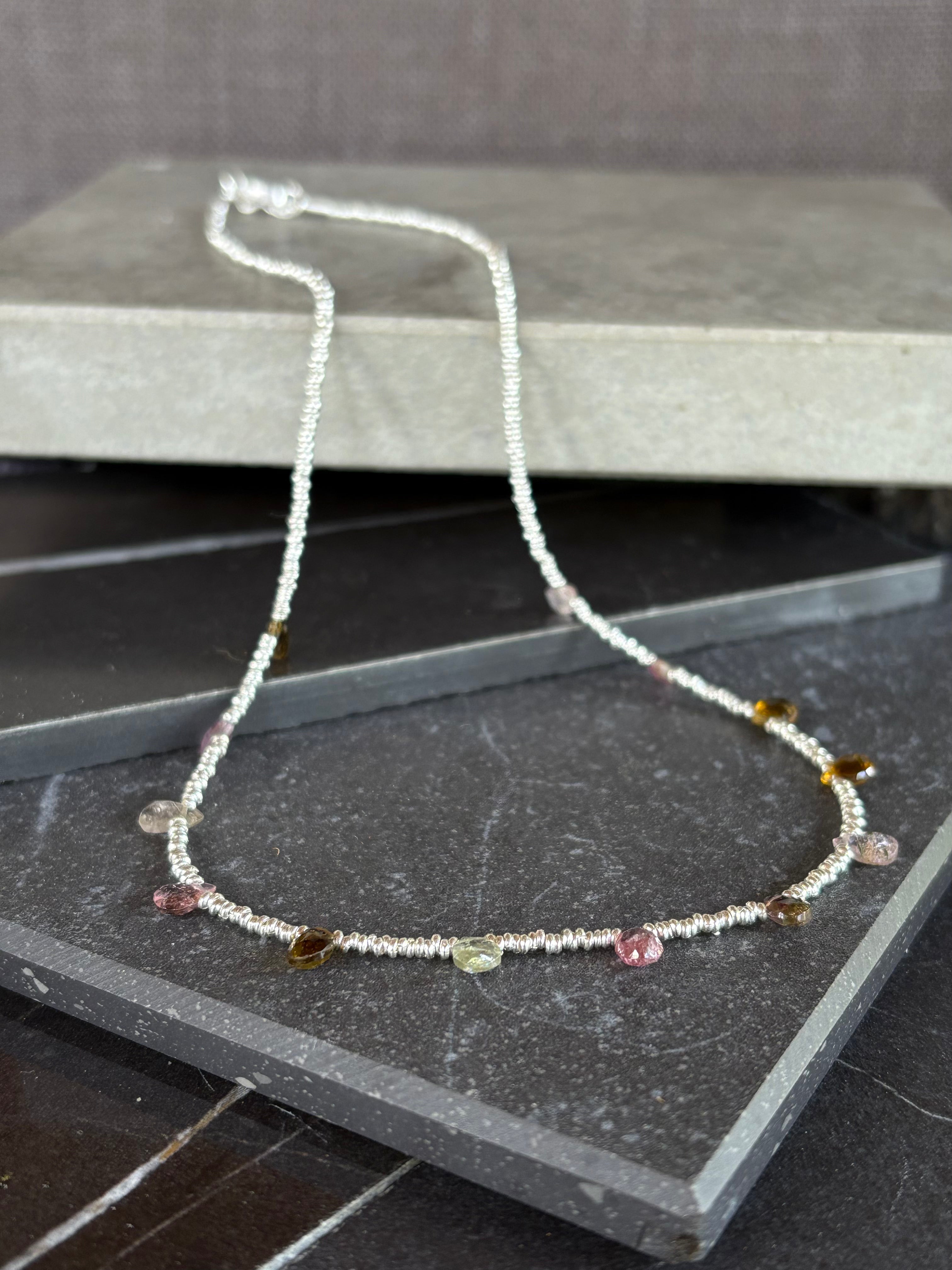 El Collar Gotas de Turmalina combina la fineza de la mostacilla de plata con la vibración natural de pequeñas gotas de turmalina, creando una pieza delicada, luminosa y cargada de energía. Su diseño corto realza el cuello con un brillo sutil y un toque de color orgánico que aporta equilibrio y elegancia.