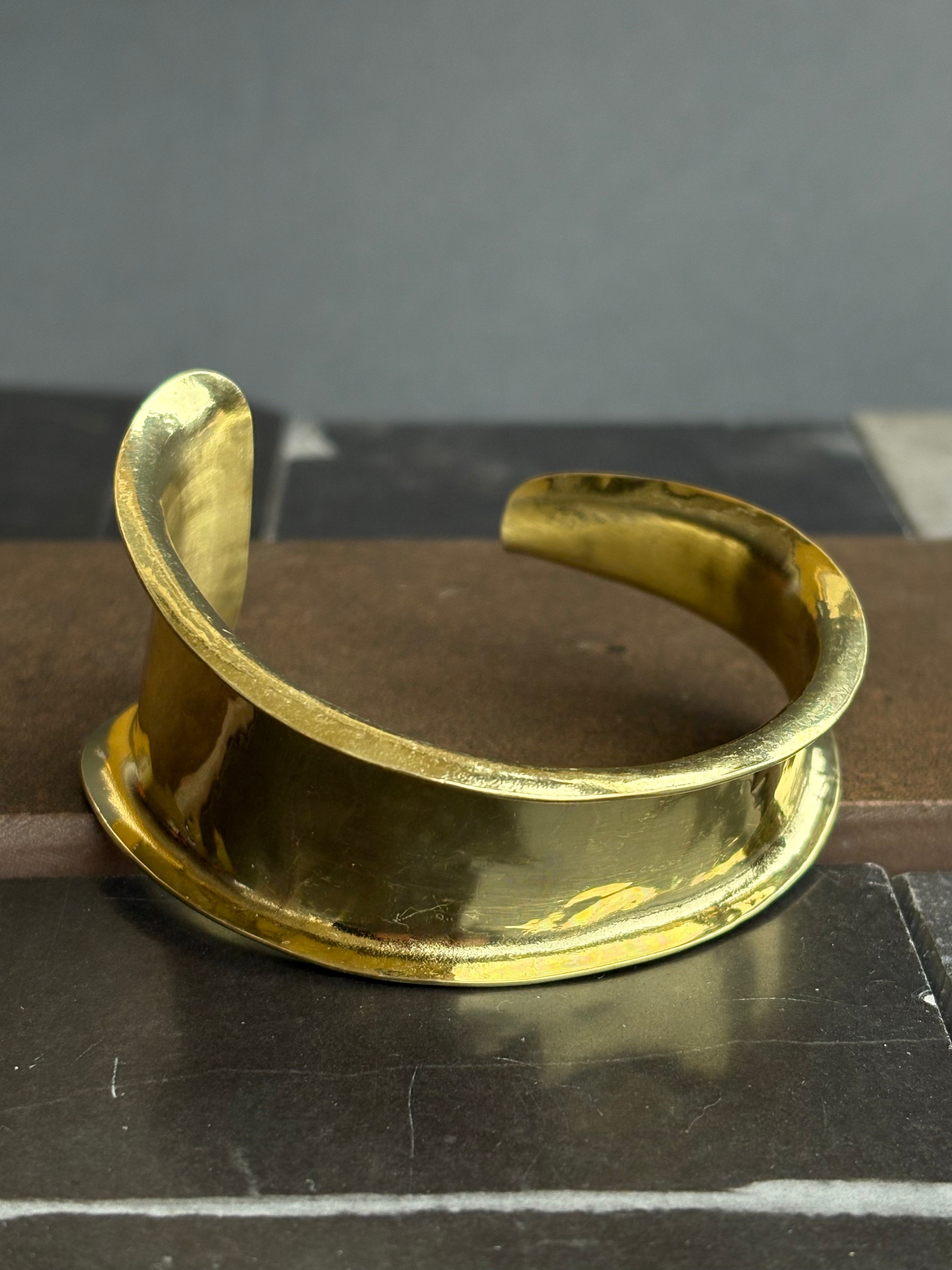 Minimalismo y luz en una sola pieza. Este brazalete está elaborado en bronce pulido, logrando un acabado dorado brillante que refleja la fuerza y calidez del metal. Su diseño limpio y elegante lo convierte en un accesorio atemporal, fácil de combinar y perfecto para realzar cualquier estilo.