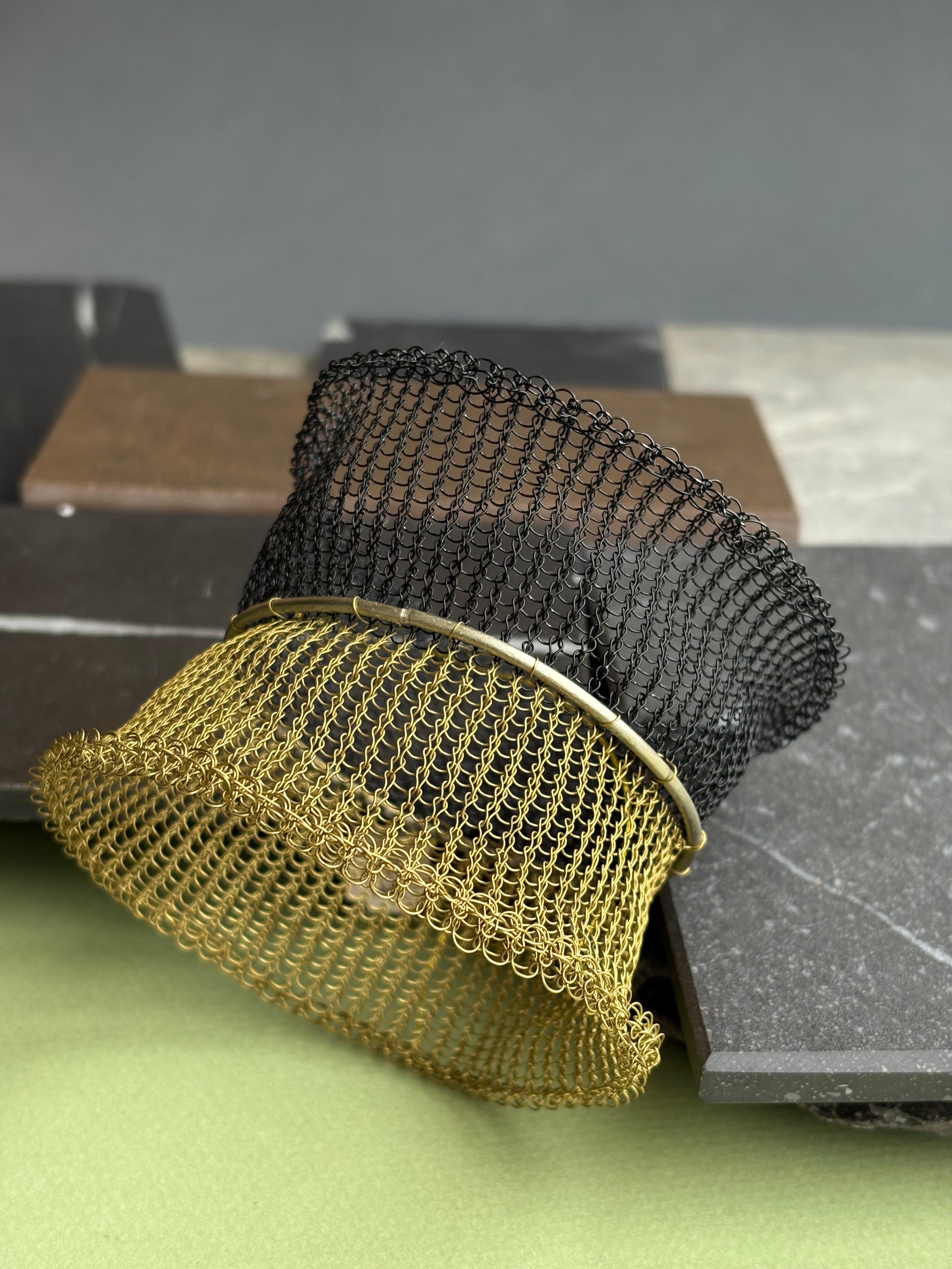 Un diseño único que une lo textil con lo metálico. Esta pulsera está tejida a crochet en tonos negros, incorporando detalles en bronce que realzan su carácter artesanal y contemporáneo.