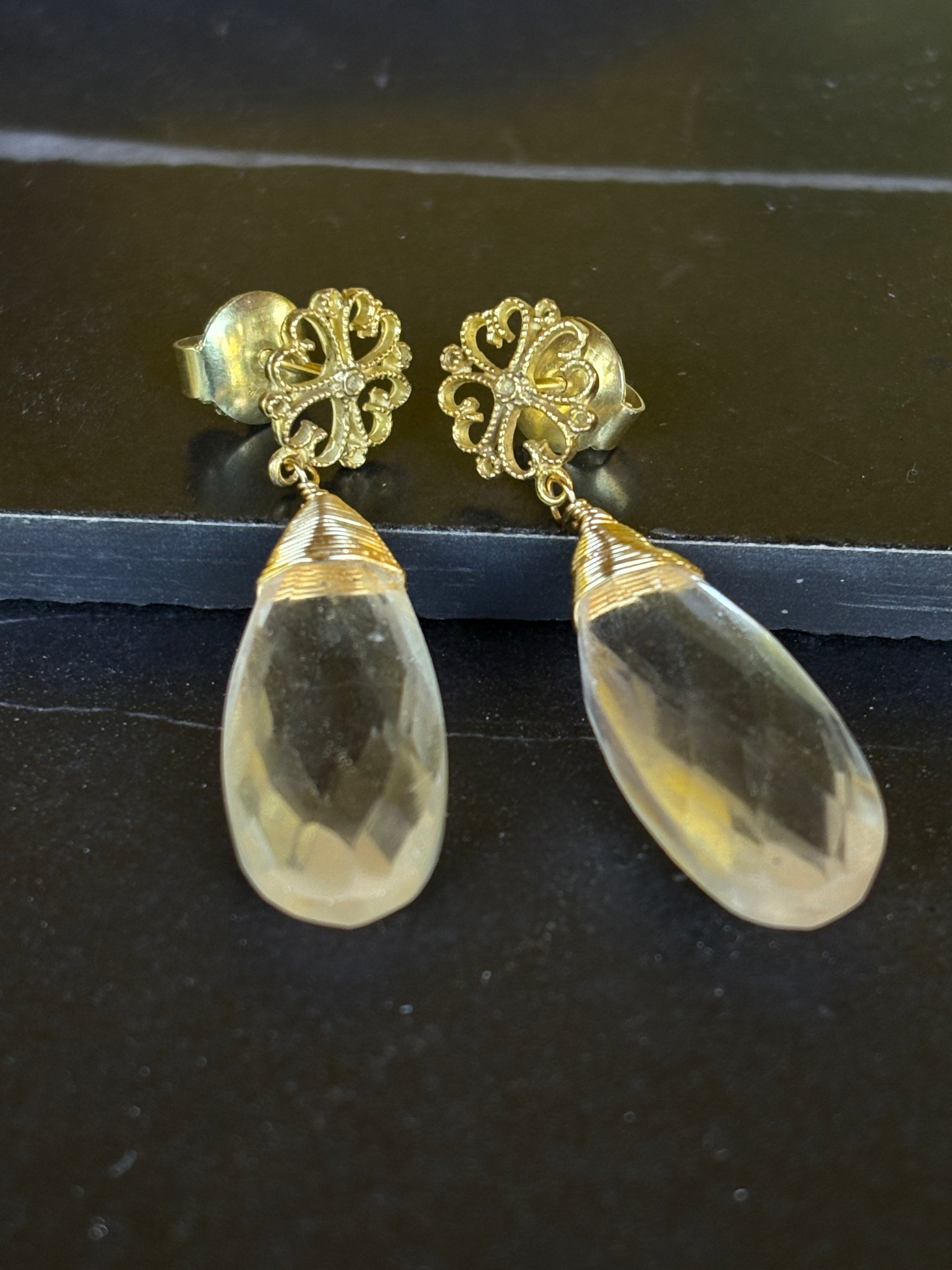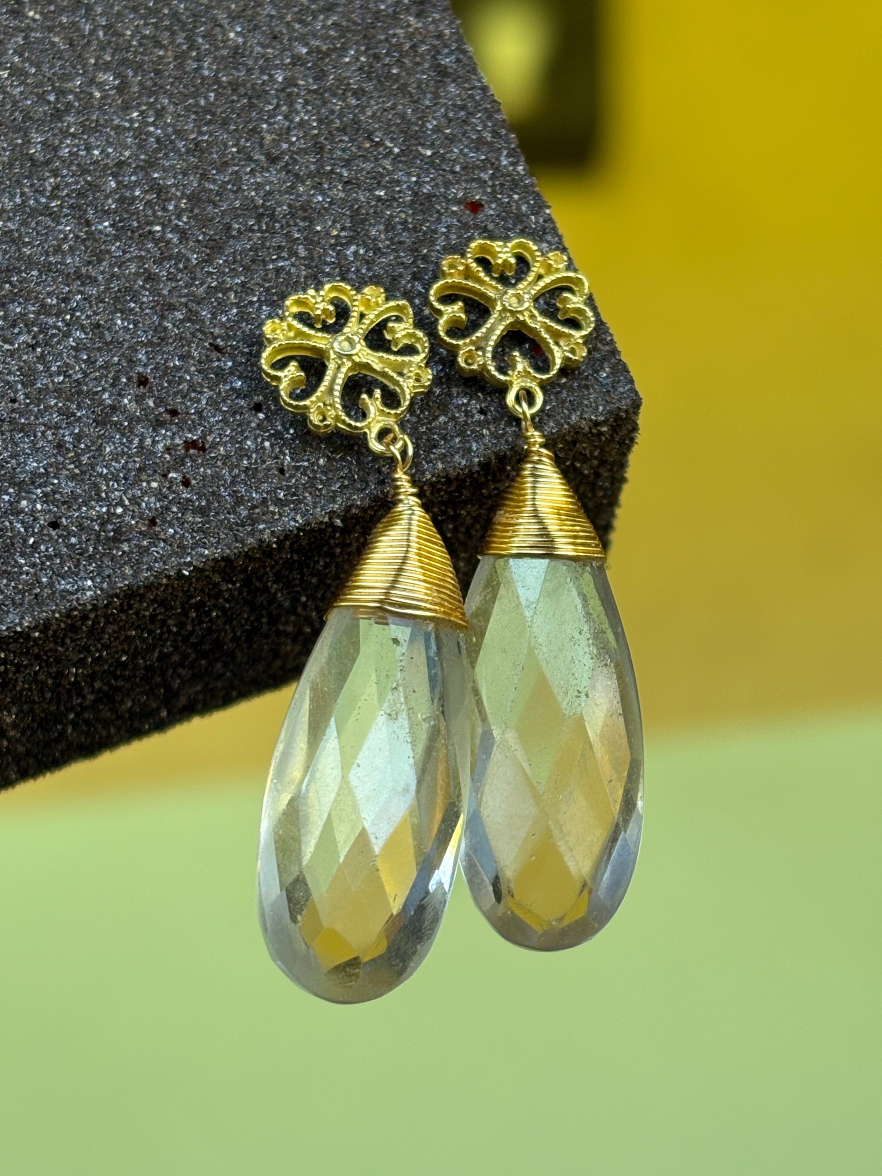 Un diseño luminoso y femenino. Estos aros combinan la pureza del cuarzo faceteado con un pin en forma de flor o lámina en metal bañado en oro, logrando un equilibrio sutil entre brillo y textura.