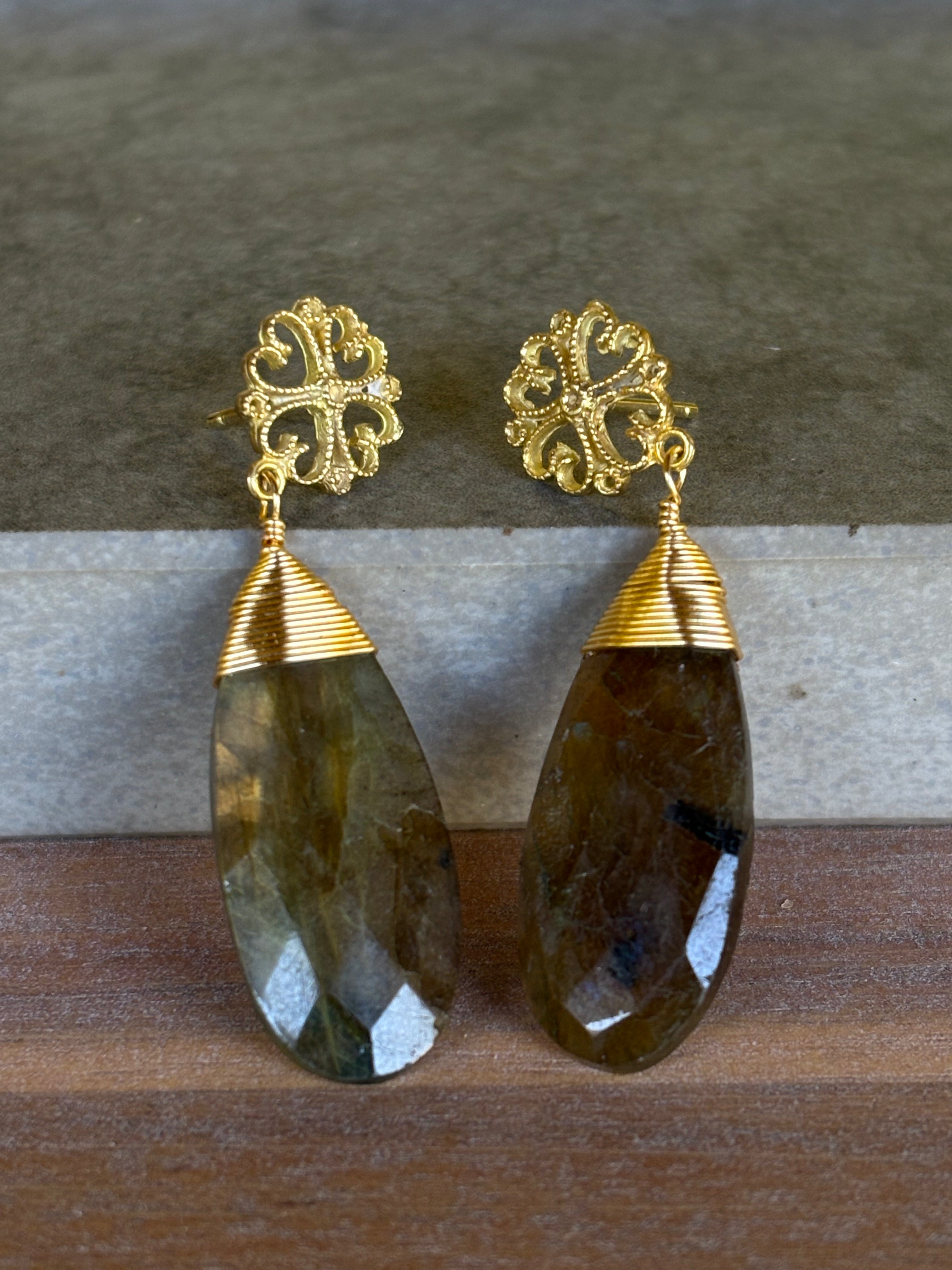 Un diseño que irradia elegancia y misterio. Estos aros de pin en plata bañada en oro están realzados con piedras labradorita, reconocidas por sus destellos cambiantes y su energía protectora.