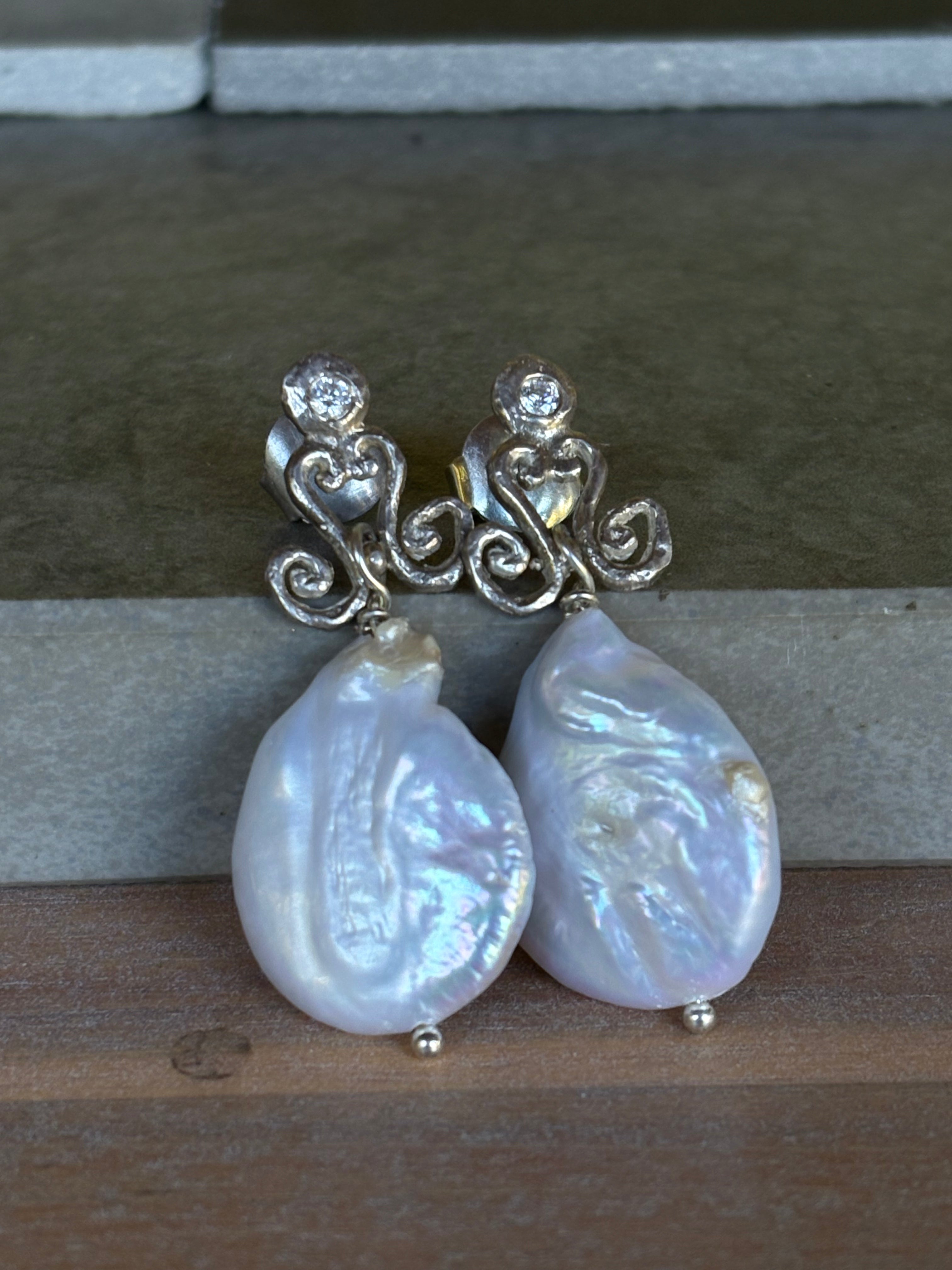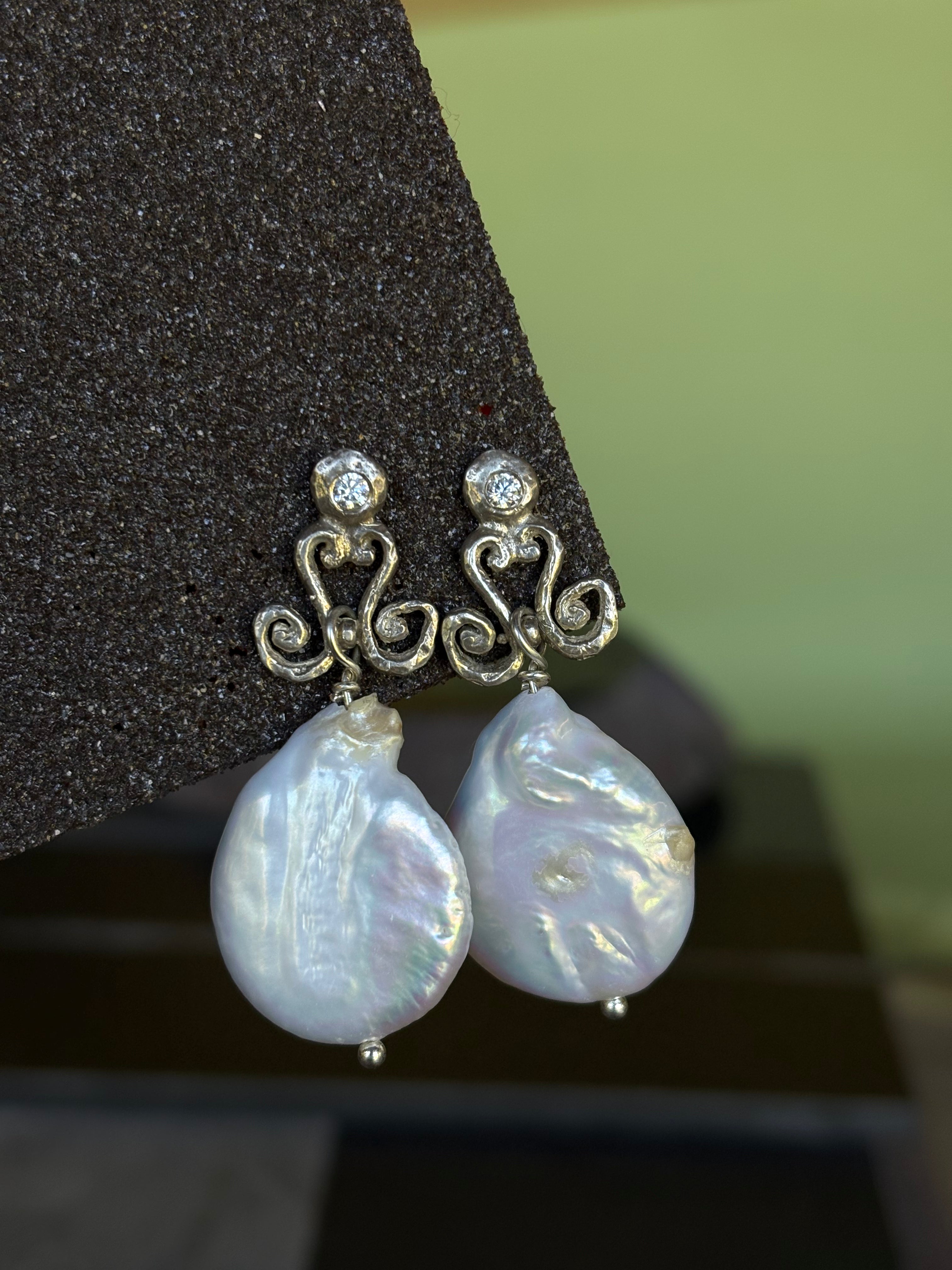 Un diseño clásico con un toque contemporáneo. Estos aros combinan la elegancia natural de la perla con un pin de plata adornado con circones, creando un contraste sutil entre brillo y suavidad.
