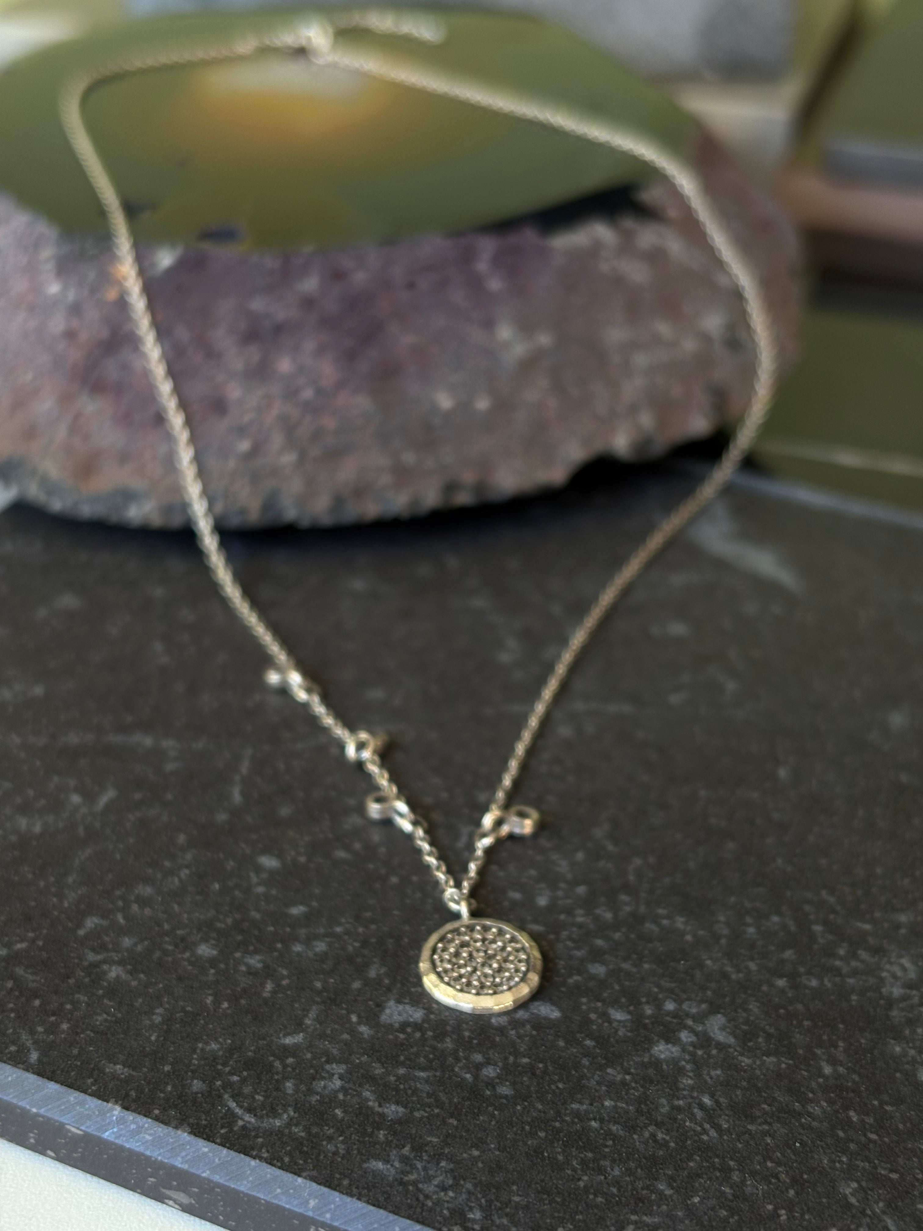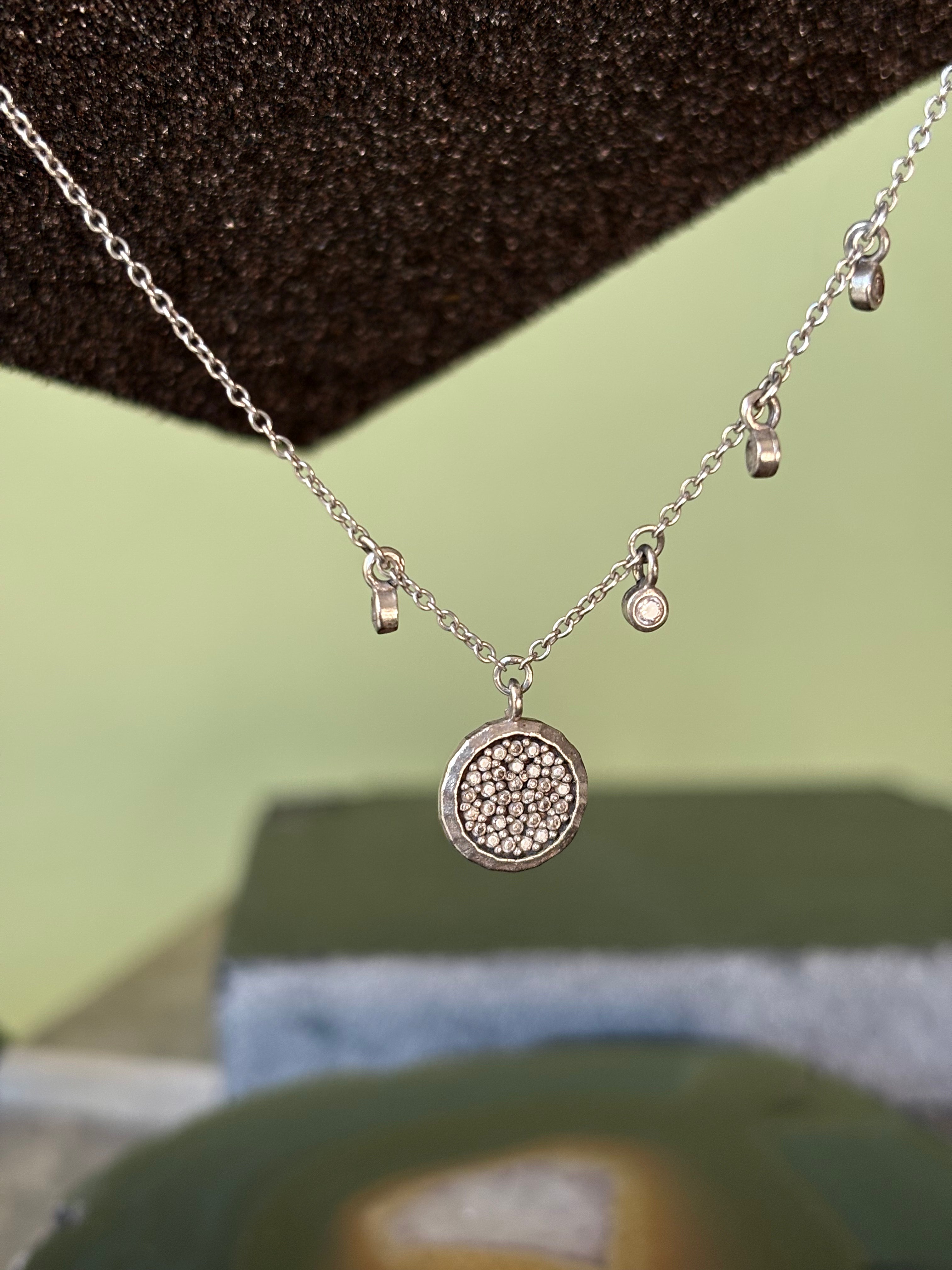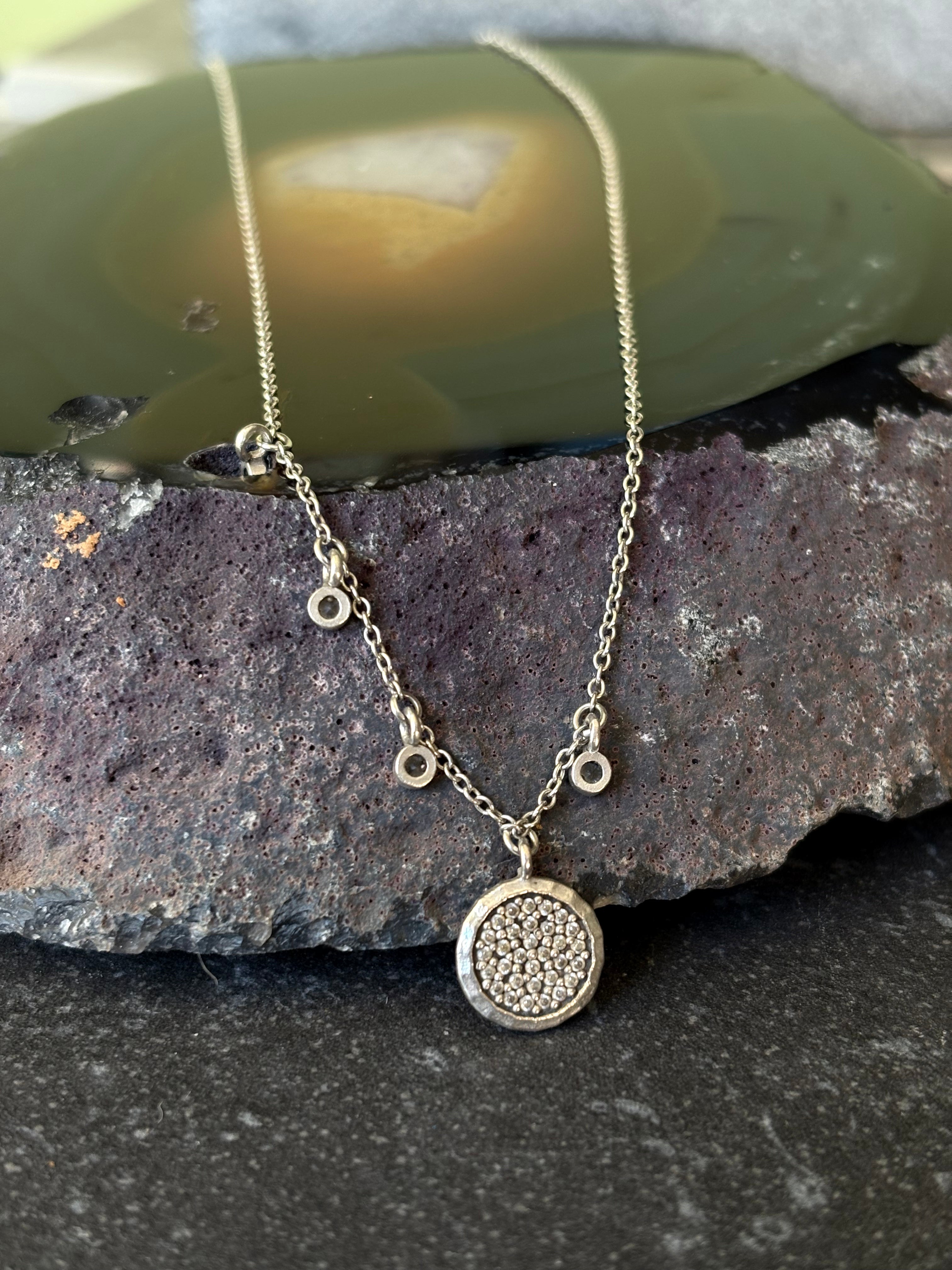 Un diseño contemporáneo y luminoso. Esta cadena de plata está adornada con pelotas de circones en disposición asimétrica, creando un juego de brillo y movimiento que aporta carácter y elegancia a la pieza.